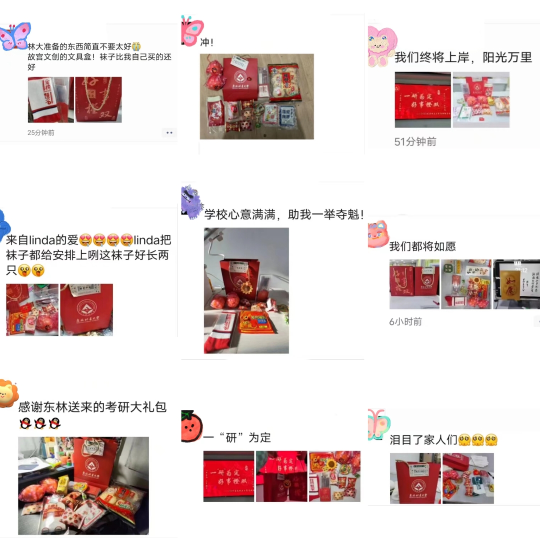 收到暖心加油包的考研学子们纷纷在朋友圈等社交平台分享自己的喜悦。“林大准备的东西简直不要太好,袜子比我自己买的都要好!”“向日葵挂件真的太好看了”“我们林大也有自己的‘百亿补贴’,东北林业大学真挺好的”……不少同学表示,学校的“考研加油包”在最后关头给予了他们源源不断的动力,相信自己一定能够取得优异的成绩,成功上岸。