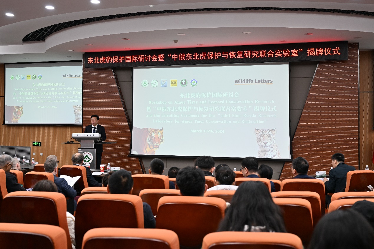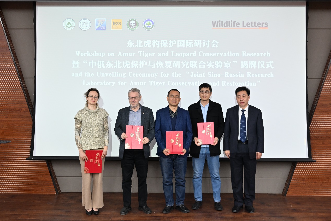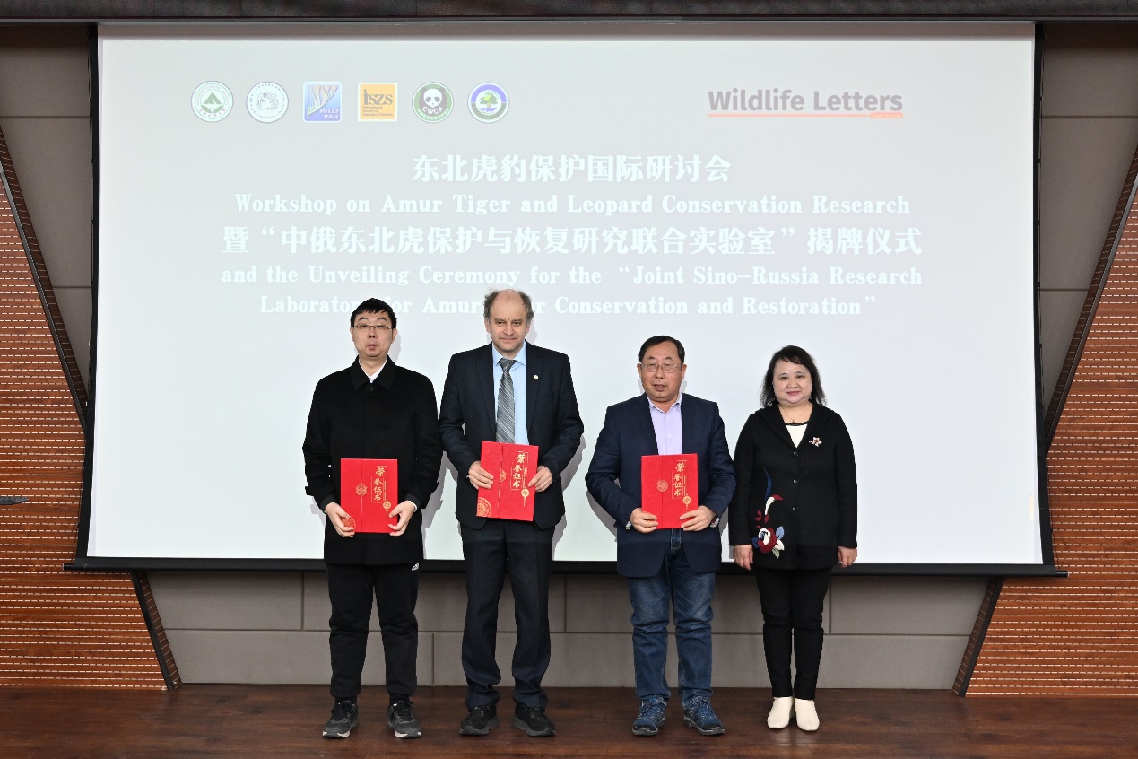 当天,国家林草局二级巡视员肖红,东北林业大学副校长刘守新,俄罗斯科学院生态与进化研究所所长奈登科研究员,俄罗斯科学院院士罗日诺夫研究员,为“中俄东北虎保护与恢复研究联合实验室”揭牌。