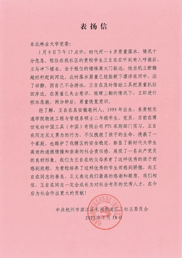 2023年1月18日,杭州市滨江区长河街道江三社区给学校寄送了表扬信,信中这样写到:王自在同志见义勇为的行为,不仅挽救了孩子的生命,挽救了一个家庭,也维护了辖区的安全稳定,彰显了新时代大学生高尚的道德情操和崇高的社会责任感,展现了一名共产党员的良好形象……感谢信还对学校培养这样优秀的学生表达敬意。