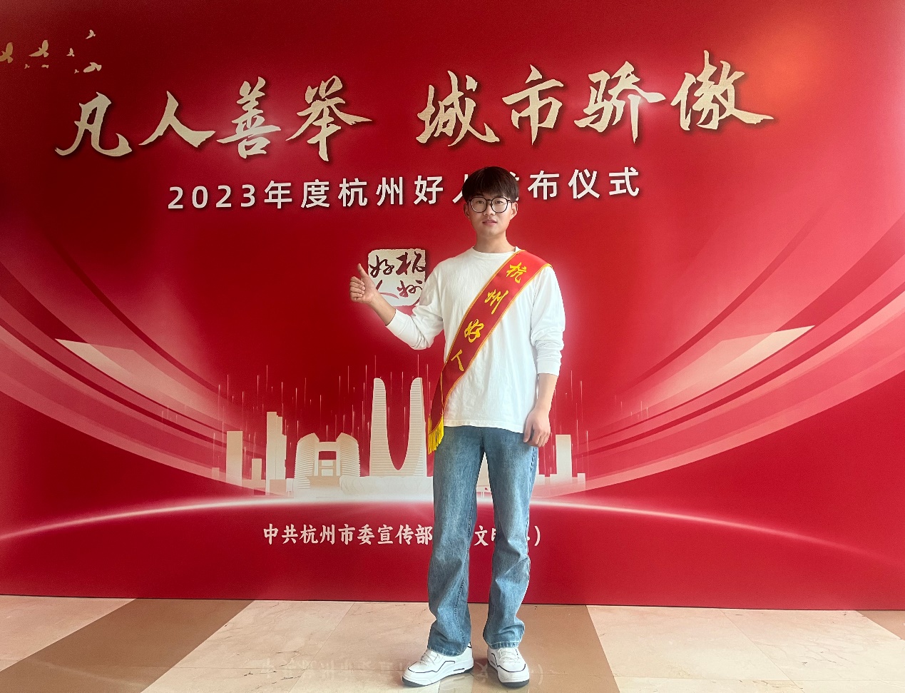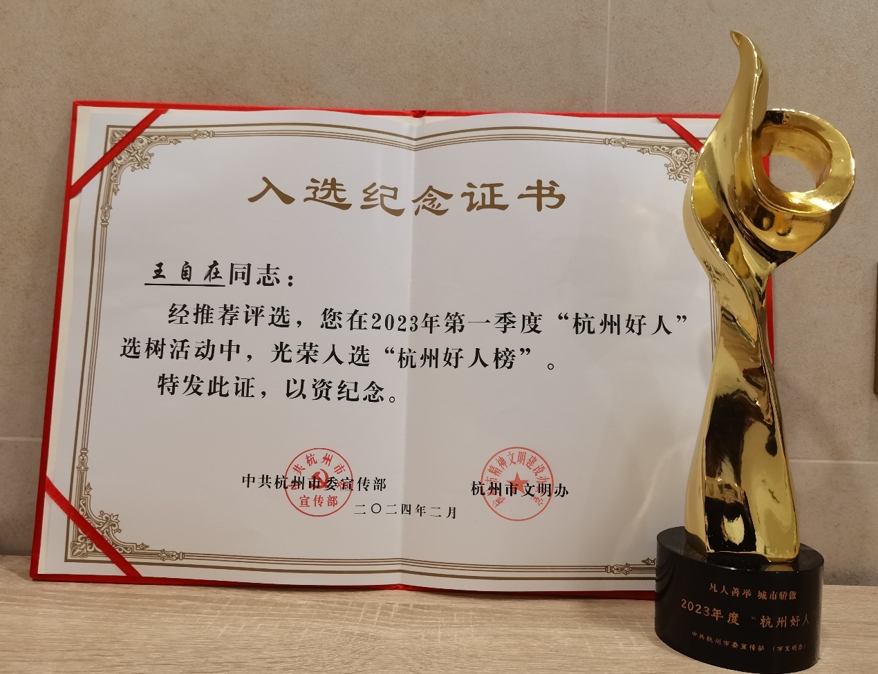 2023年6月2日,2023年第一季度“杭州好人”名单,王自在荣登榜单,而当时已经完成实习回到学校的王自在竟然不为所知。直到2024年1月19日,杭州市滨江区文明办工作人员联系他领取“杭州好人”的慰问品时,他才知道自己多么幸运。平凡岁月里的一个小小举动,竟然被这么多的人所看见、所关注。2024年1月22日,杭州市委宣传部(文明办)向王自在寄送了《致全市道德模范(杭州好人)的慰问信》。