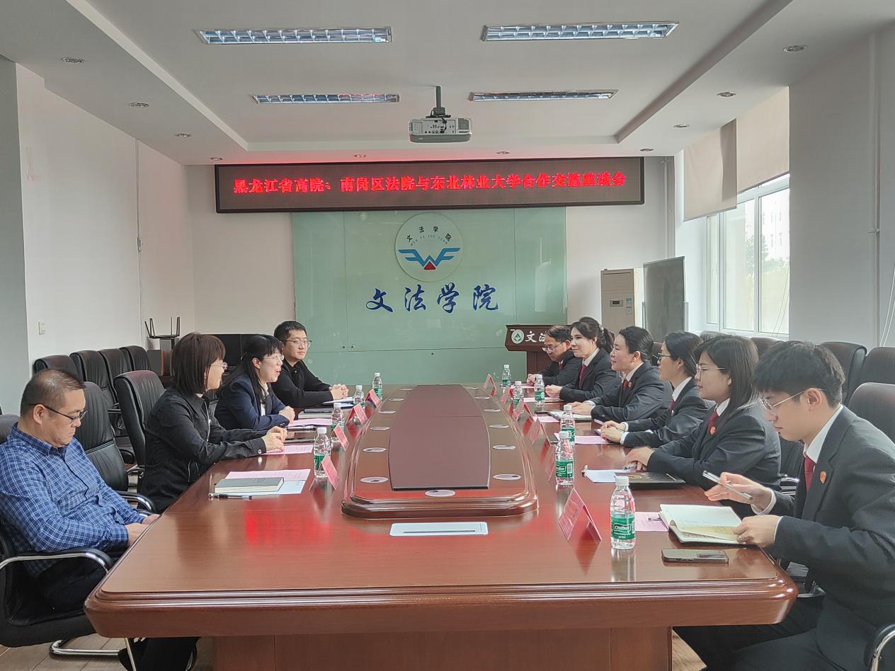 庭审结束后,黑龙江省高级人民法院、南岗区人民法院知识产权法庭的法官与文法学院领导班子召开了合作交流座谈会。会上,院长朱文玉介绍了东北林业大学在知识产权方面的研究基础以及文法学院法学专业的发展情况,希望能与黑龙江省高级人民法院和南岗区人民法院在实践实习、案例研究、人才培养等方面加强合作,促进法学理论与司法实践深度融合,共同构建新时代知识产权协同保护发展新格局。黑龙江省高级人民法院民三庭副庭长马文静简要介绍了省高院知识产权案件审理情况以及工作成绩。她表示,日后将积极推动知识产权法学教育和司法实践深度融合,实现人民法院审判工作与高校教学科研工作“双向赋能”。