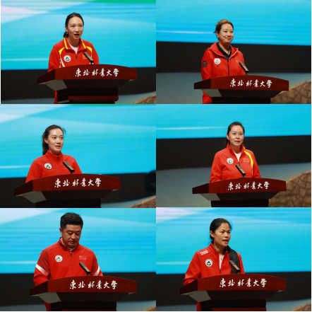 冠军们依次分享了各自在服役期间为国争光、无私奉献、团结协作、顽强拼搏的心路历程和光辉时刻,以及在担任教练期间与学员一起摸爬滚打、不断突破的动人事迹和取得的傲人成绩。李文文以视频形式向观众展示了个人成长历程和“夺金时刻”,她勉励东林学子要以善良的心待人,以专业的心做事,不管未来的路有多么坎坷,都要牢记初心,方能在人生的旅途中始终保持清醒的头脑和坚定的步伐;李爽结合个人参赛经历,鼓励同学们不论面对多少低谷和磨难,都要紧握梦想、脚踏实地、勇往直前,最终一定能抵达胜利的彼岸;朱秋颖分享了个人在专业学习道路上遇到的坎坷和困难,她表示,冠军仅代表一时的荣耀,而面对失败,如何让自己重拾信心、继续前行才是人生应有的态度和永恒的主题;于鑫娜阐释了冰壶运动的起源和技巧,她表示,冰壶是集健身与竞技于一体的运动项目,需要队员相互沟通、彼此协作,以实现团队能量最大化;杜超讲到,凡是比赛皆有胜利和喜悦、亦有失败和痛苦,但正是这些经历塑造了现在的自己,因为每一场比赛都是一次成长甚至蜕变;马海燕结合个人执教经历和感悟,鼓励同学们要珍惜参与亚冬会、服务亚冬会的机会,用实际行动为亚冬会的成功举办作出贡献,留下美好记忆。现场氛围热烈,喝彩不断,掌声连连,师生无不被冠军们的精彩事迹感染着、感动着。
