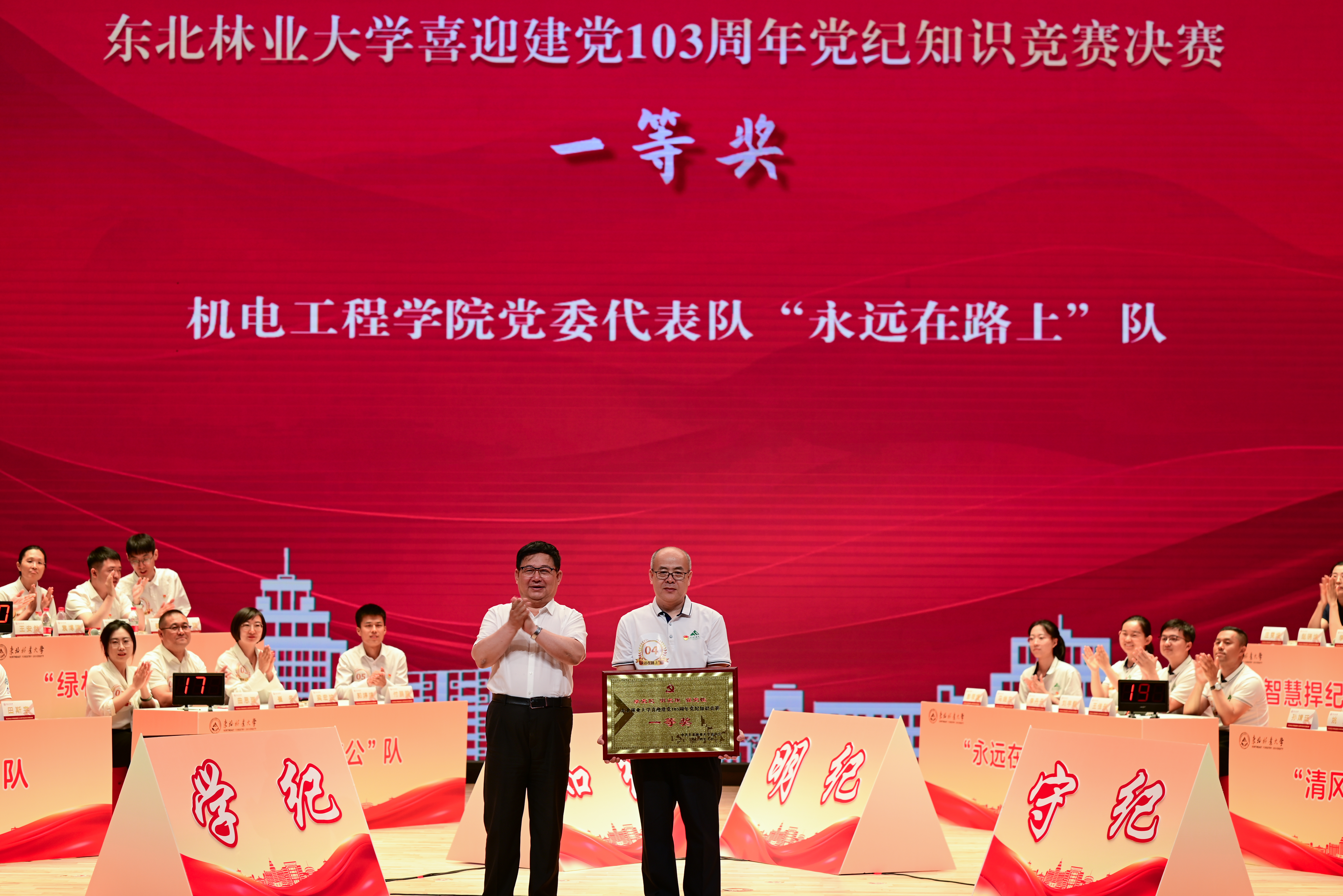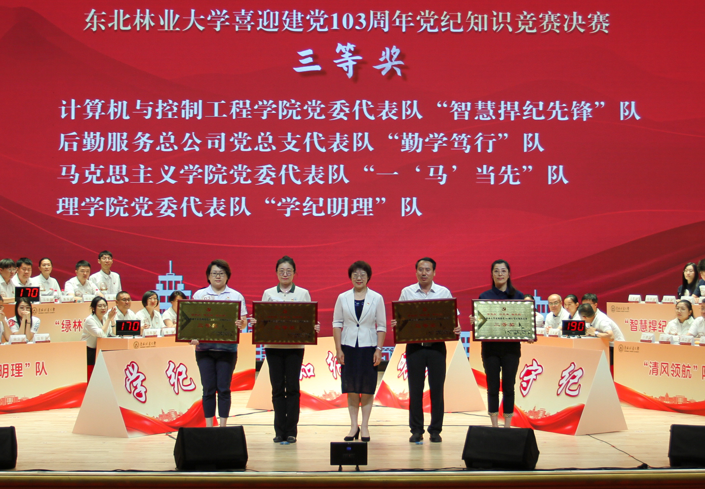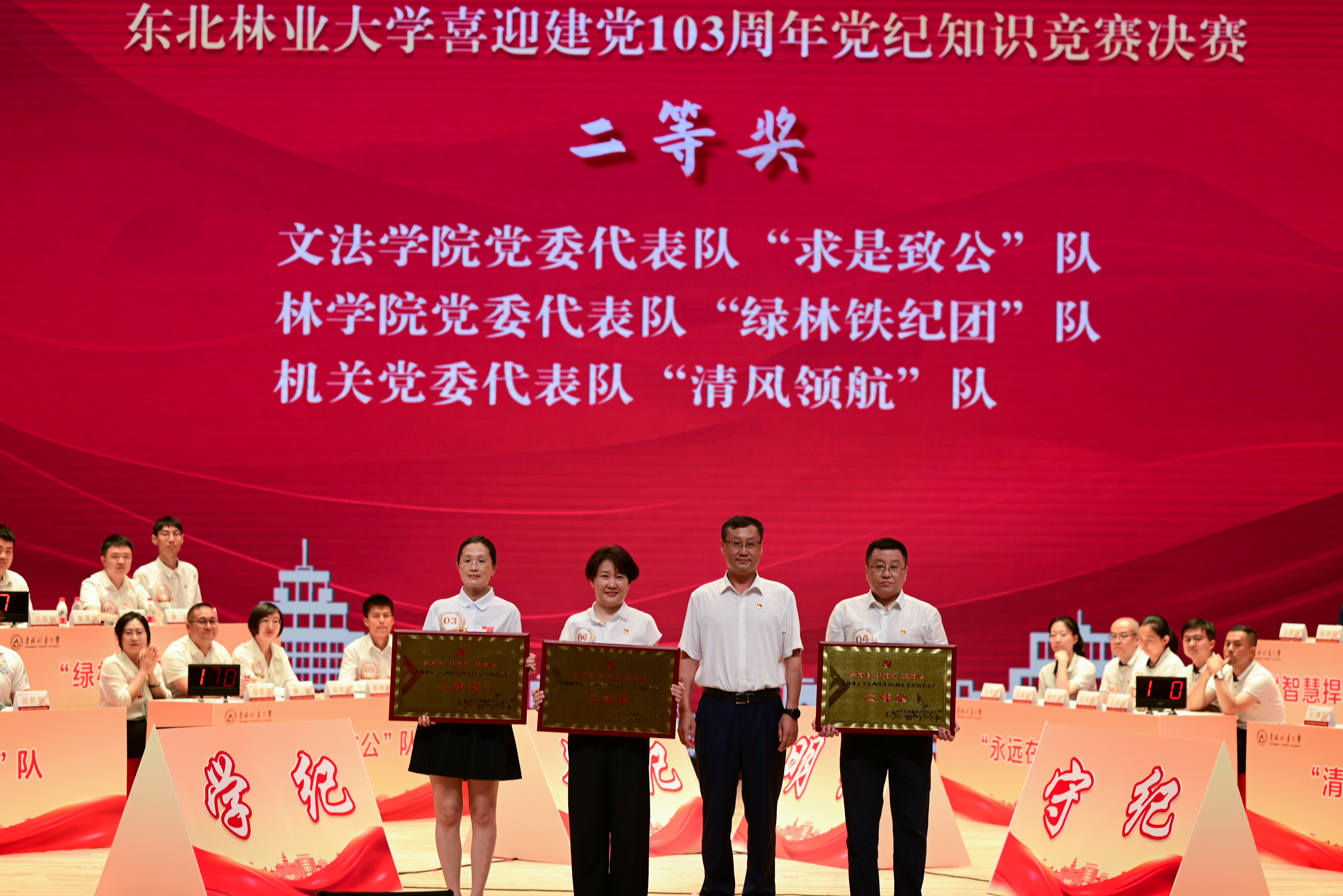 为深入学习贯彻习近平总书记关于党纪学习教育的重要讲话和重要指示批示精神,创新学习形式,提高学习质量,7月1日下午,由东北林业大学党纪学习教育工作专班主办、经济管理学院承办的“学党纪、明党规、强党性,喜迎建党103周年”党纪知识竞赛决赛在科学会堂隆重举行。