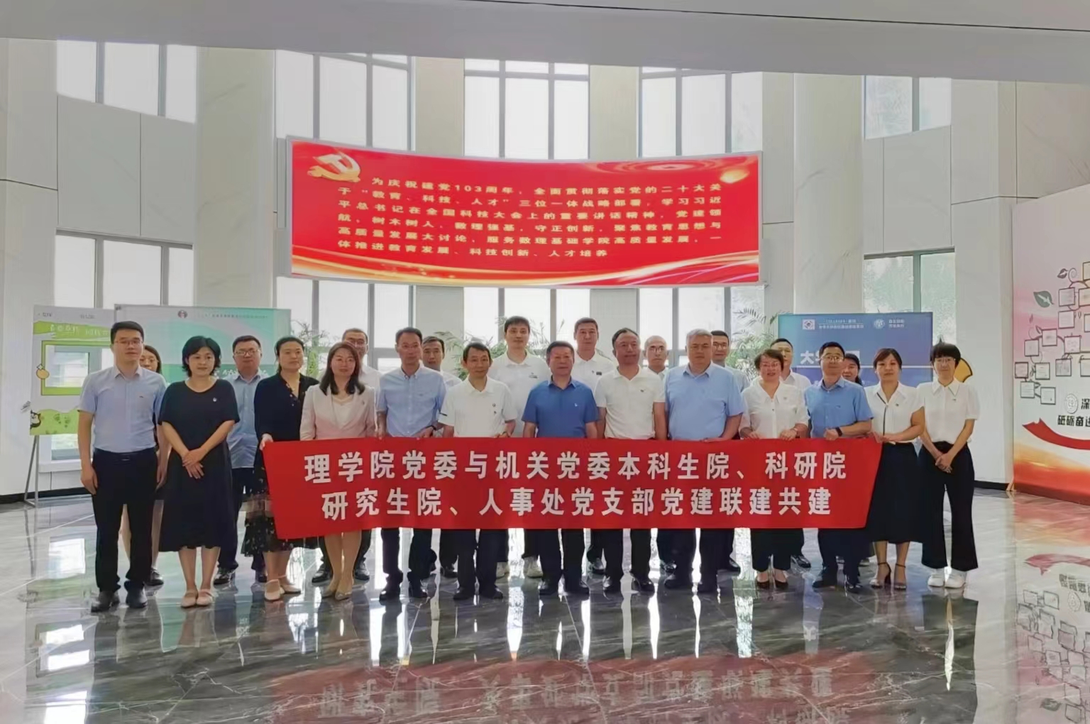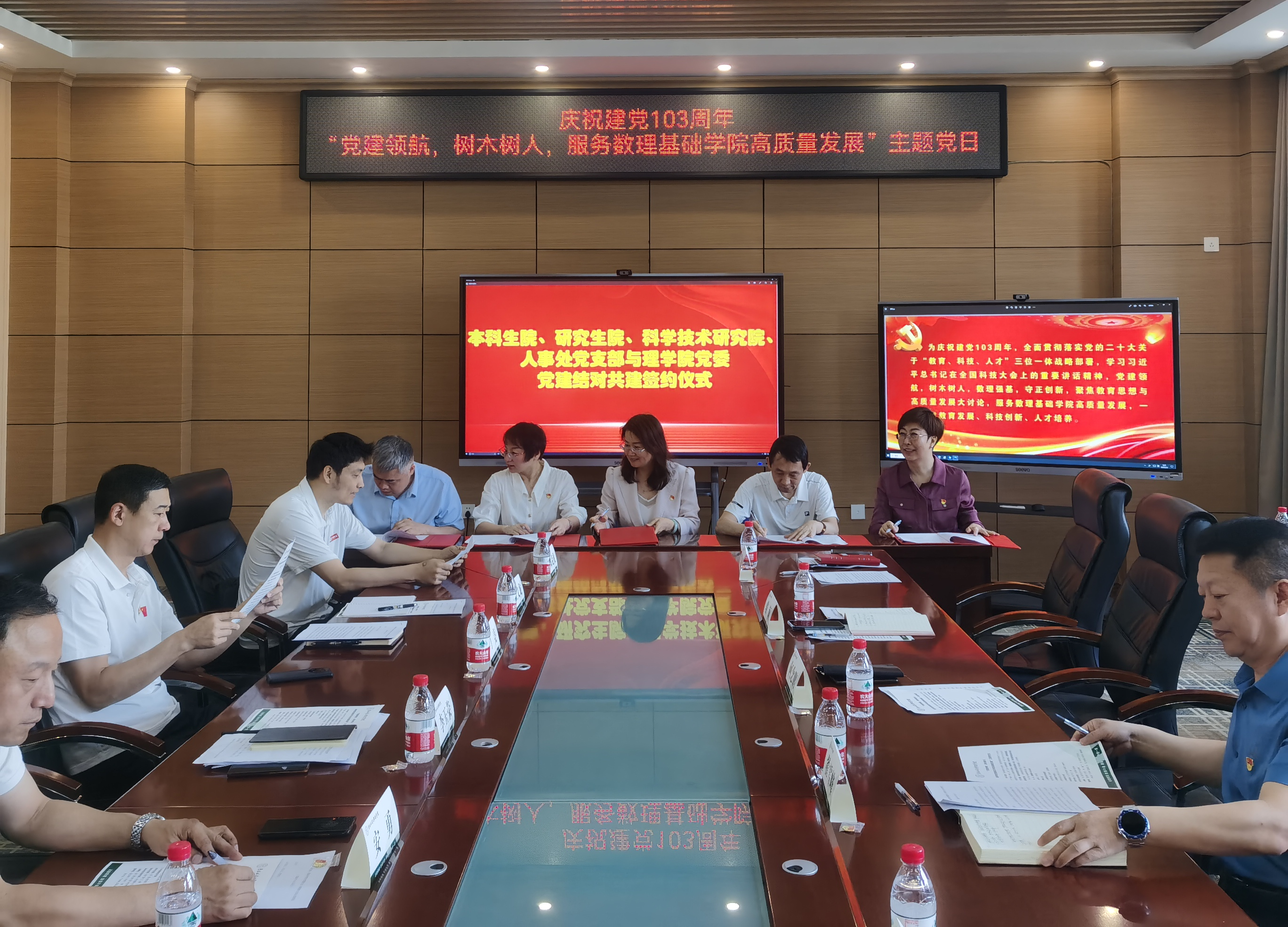 为庆祝中国共产党成立103周年,7月1日上午,“党建领航,树木树人,服务数理基础学院高质量发展”主题党日暨四个机关党支部与理学院党委党建共建签约仪式在锦绣楼410会议室举行。学校党委常委、副校长翟雪峰,发展规划处、本科生院、研究生院、科研院、人事处党支部代表及理学院班子成员、党员代表参加此次主题党日活动。会议由理学院党委书记李玉荣主持。
