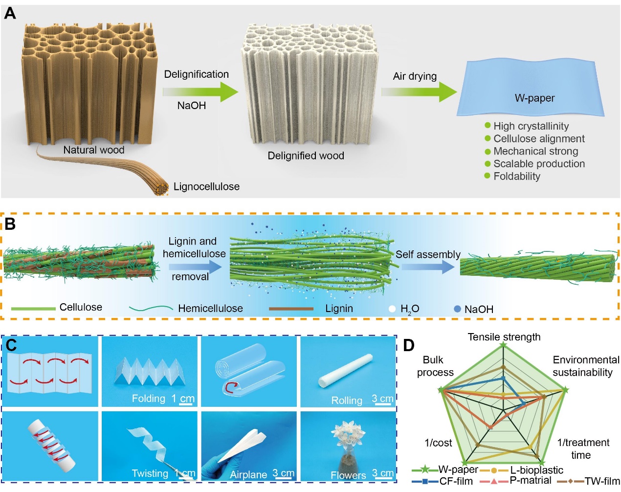 7月26日,国际综合性期刊《科学进展》(Science Advances)在线发表了我校材料科学与工程学院甘文涛教授研究团队题为“Superstrong, Sustainable, Origami Wood Paper Enabled by Dual-phase Nanostructure Regulation in Cell Walls”的研究论文。该研究首次提出通过两相纳米结构调控,将天然轻木转化为一种兼具高强度和高韧性的木材薄膜,并揭示了其力学增强机理,为木材保护与功能改良提供了新理论。