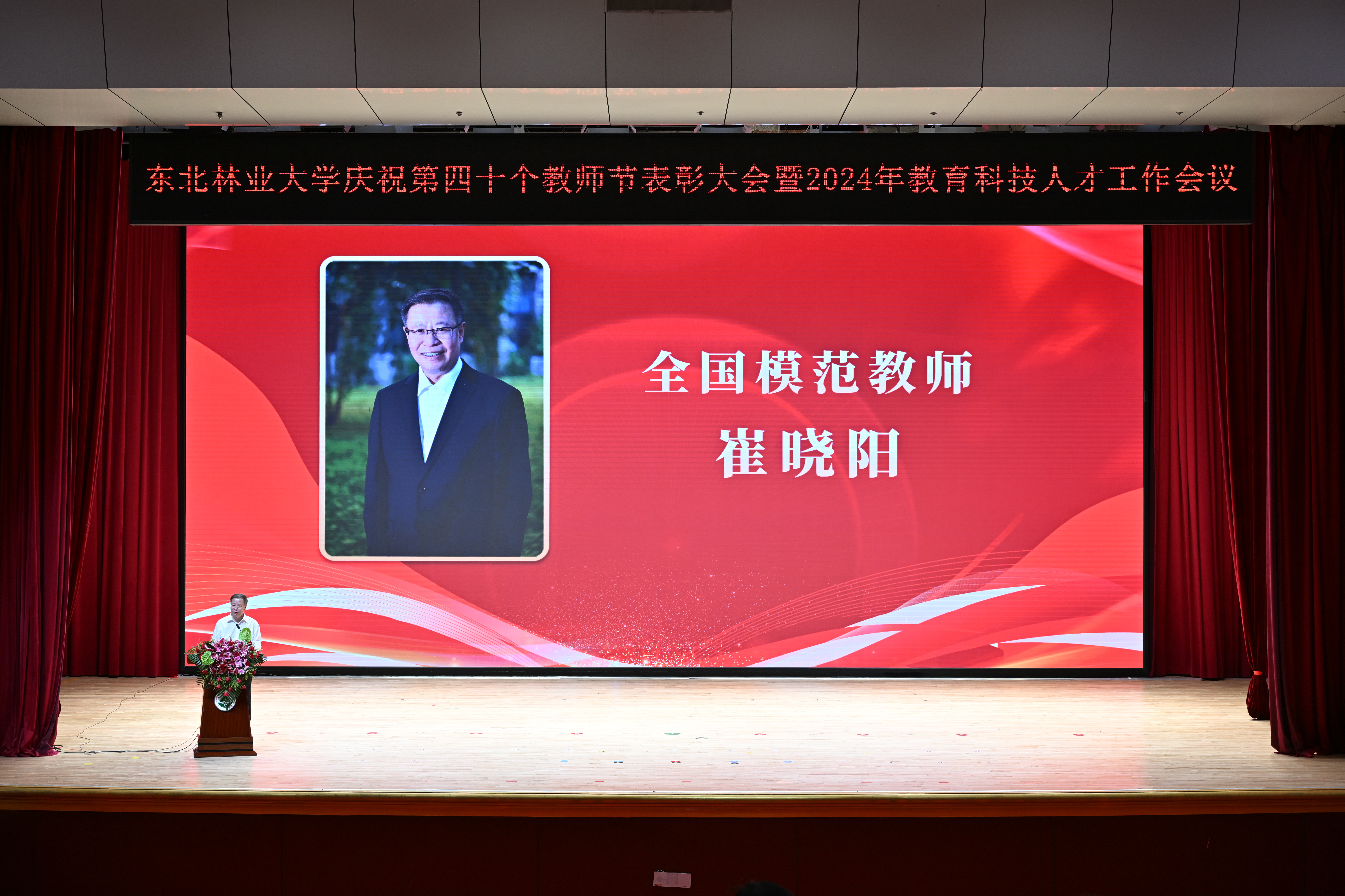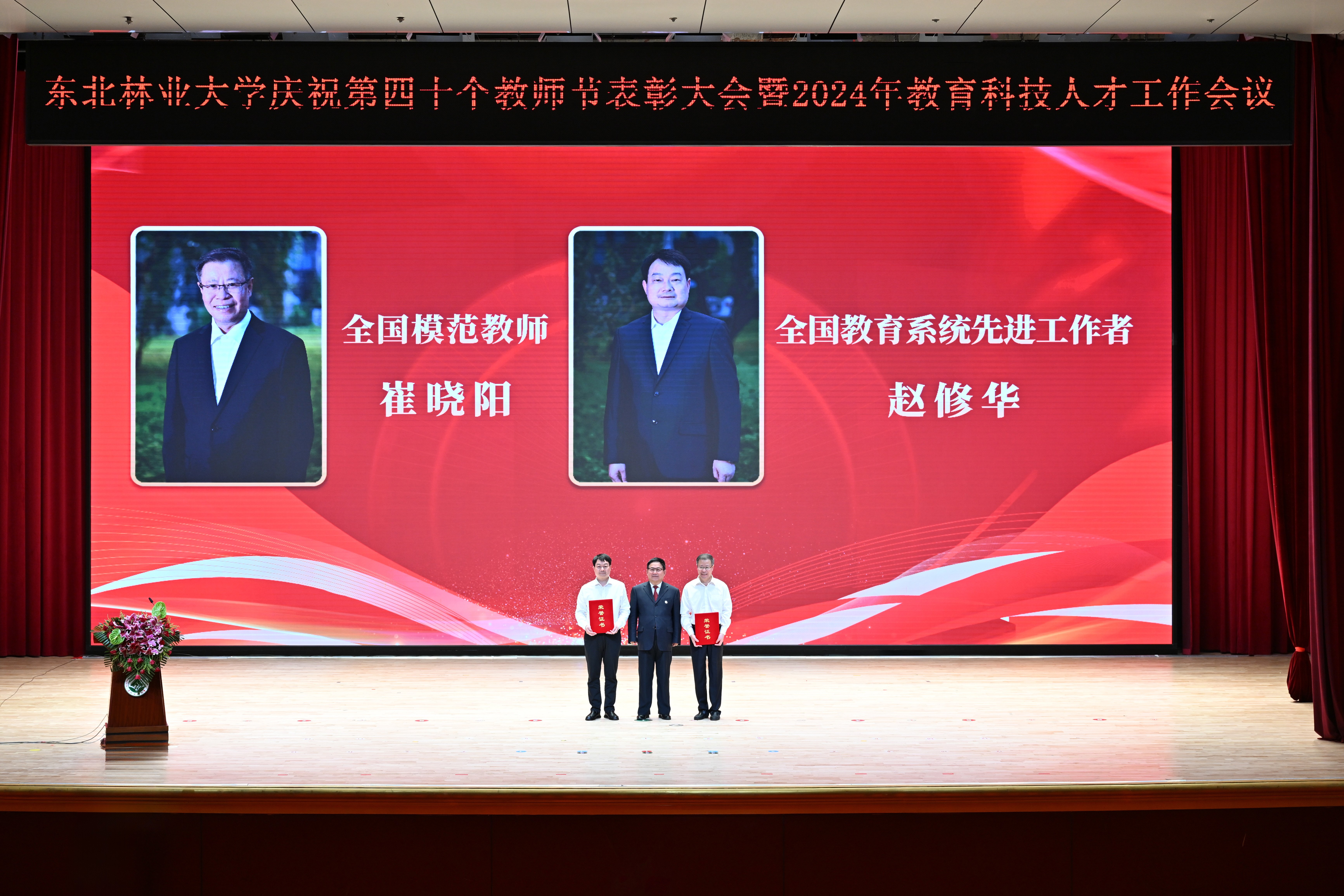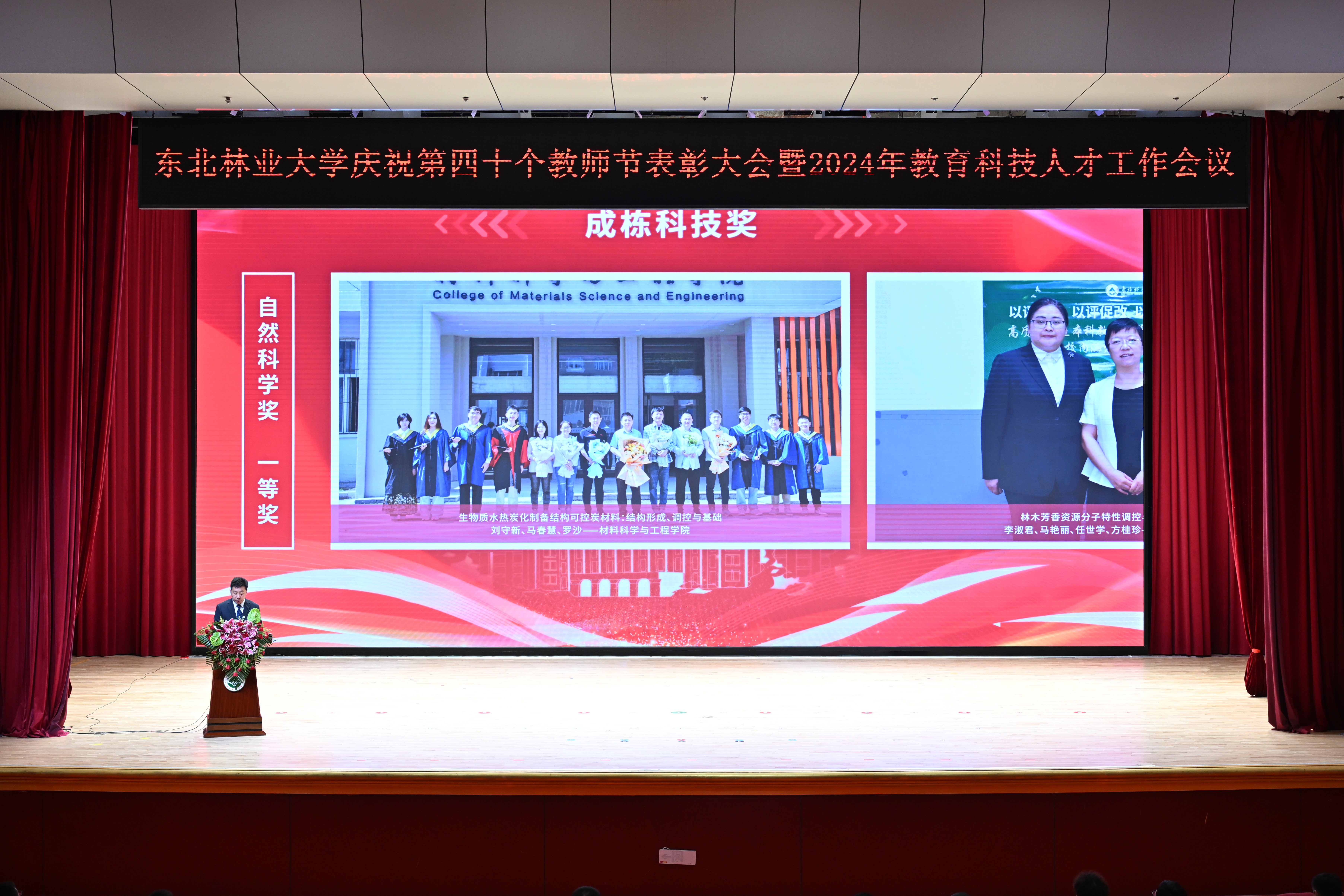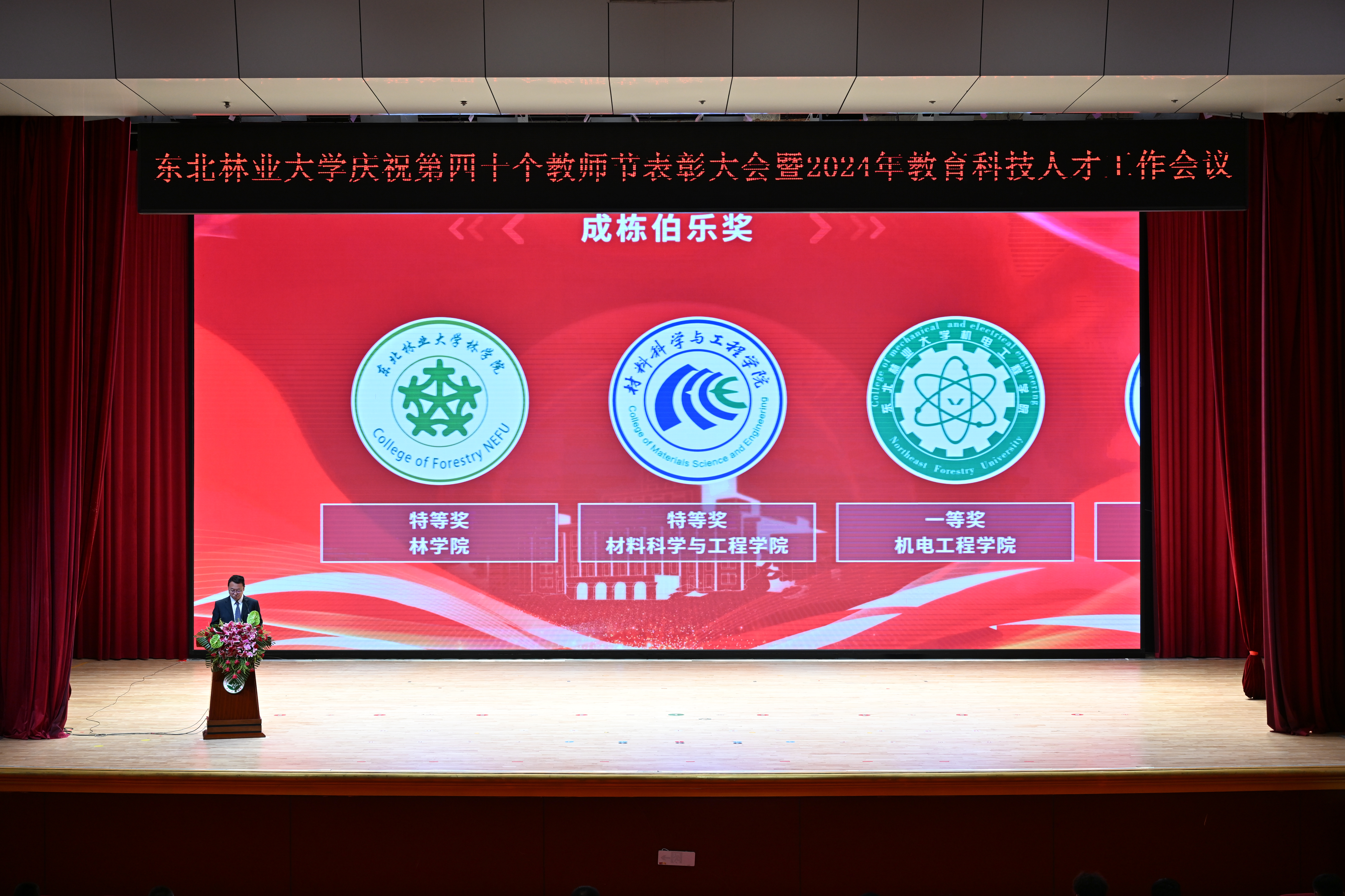 学校党委常委、副校长刘守新宣读《东北林业大学关于2022、2023年度成栋科技奖的评选结果》。学校党委常委、副校长李明泽宣读《东北林业大学关于2022、2023年度成栋伯乐奖的评选结果》。学校党委副书记、纪委书记宋吉红宣读《中共东北林业大学委员会关于表彰2022—2024年度“三育人”先进个人的决定》。