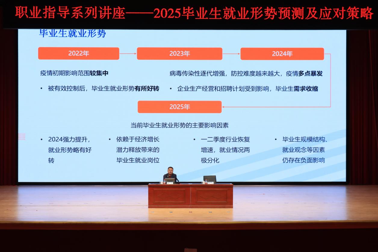 为深入学习贯彻党的二十届三中全会精神,落实党中央、国务院“稳就业”“保就业”决策部署,帮助学生深度洞察当前就业形势,积极调整就业观念,提升职业素养和求职竞争力,推动毕业生高质量充分就业,9月13日和14日,就业指导与合作发展处邀请校外专家,在科学会堂开展“把握就业脉搏,调整预期早行动——新形势下的精准职业指导系列讲座”活动,为我校毕业生的求职之路保驾护航。
