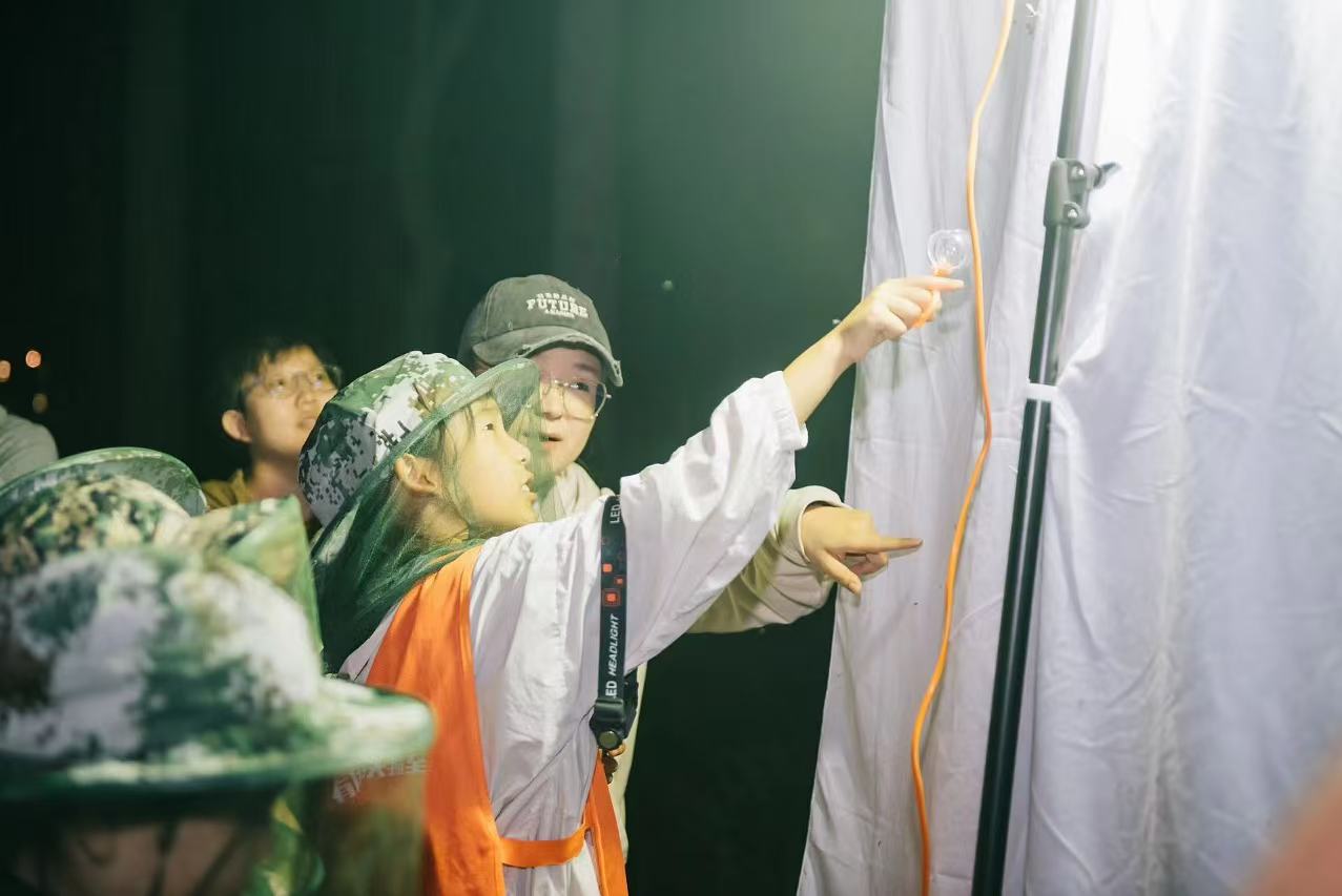“老师,你看,这是蝴蝶还是蛾子?”“老师,你听,这是什么昆虫的叫声?”……只见孩子们身穿荧光马甲,头戴防虫帽和头灯,身背昆虫盒,正在与老师们一起穿梭在东北林业大学林场中,夜探森林。