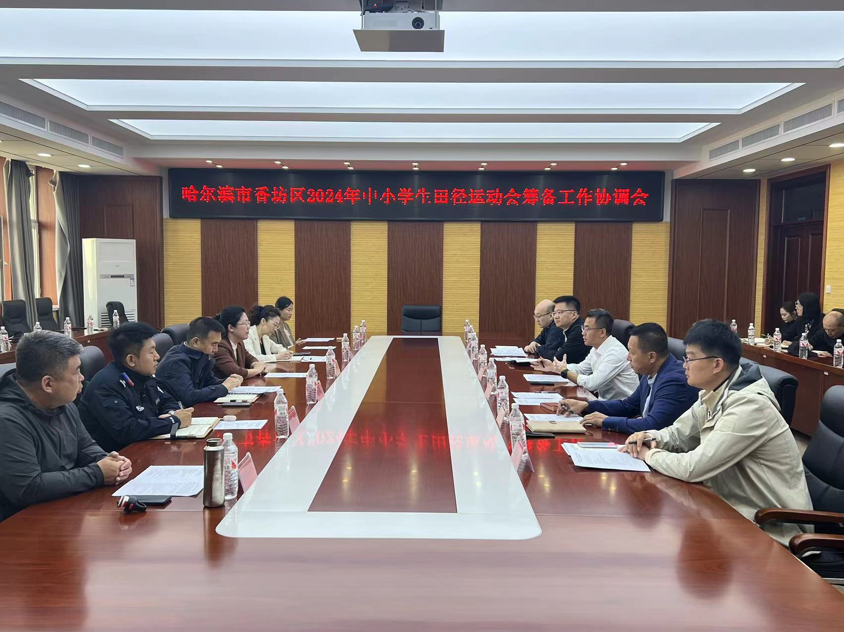 运动会筹备期间,学校领导高度重视,校党委常委、副校长张春雷组织召开筹备工作协调会议,部署推动每个相关部门工作。体育部统筹协调,提供场地、器材、音响设备保障;保卫处召开专门会议,研究制定工作方案和应急预案,配合香坊教育局多次踏查场地,提前发布校内交通管控通知,出动巡逻车辆10余台,安保人员30余人次;后勤保障部抽调保洁、配餐、物资搬运等专门力量,多部门联动形成合力,推动服务保障有力有效。