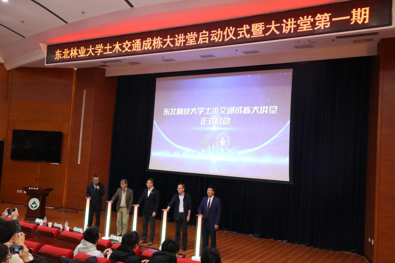 张春雷、洪汉平、段忠东、谢启芳、于鹏共同按下“土木交通成栋大讲堂”启动按钮。在全场热烈的掌声下,大讲堂第一期讲座正式开始。