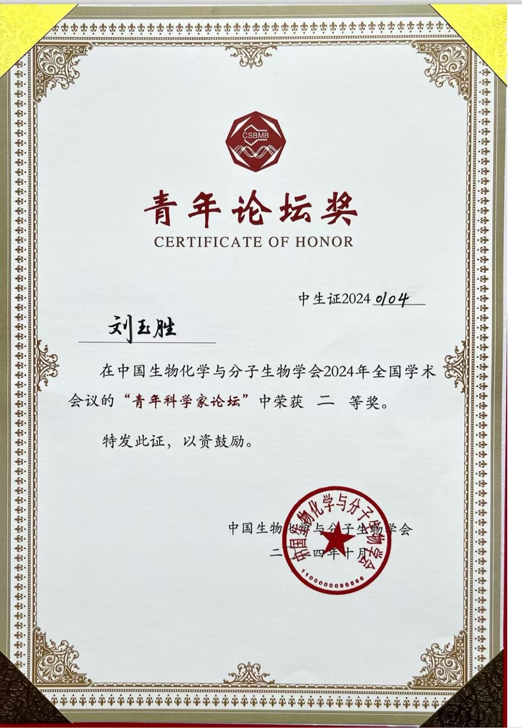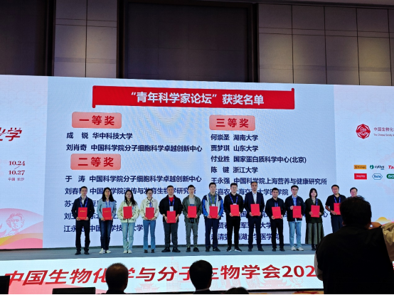 10月24日至27日,中国生物化学与分子生物学会2024年全国学术大会在湖南省长沙市召开,大会的主题是“变革中的生物化学”。会议共有2000余名来自世界各地的知名学者和专家出席。我校生命科学学院刘玉胜教授,在100多位候选者中成为17位青年科学家论坛报告人之一,并获得二等奖。