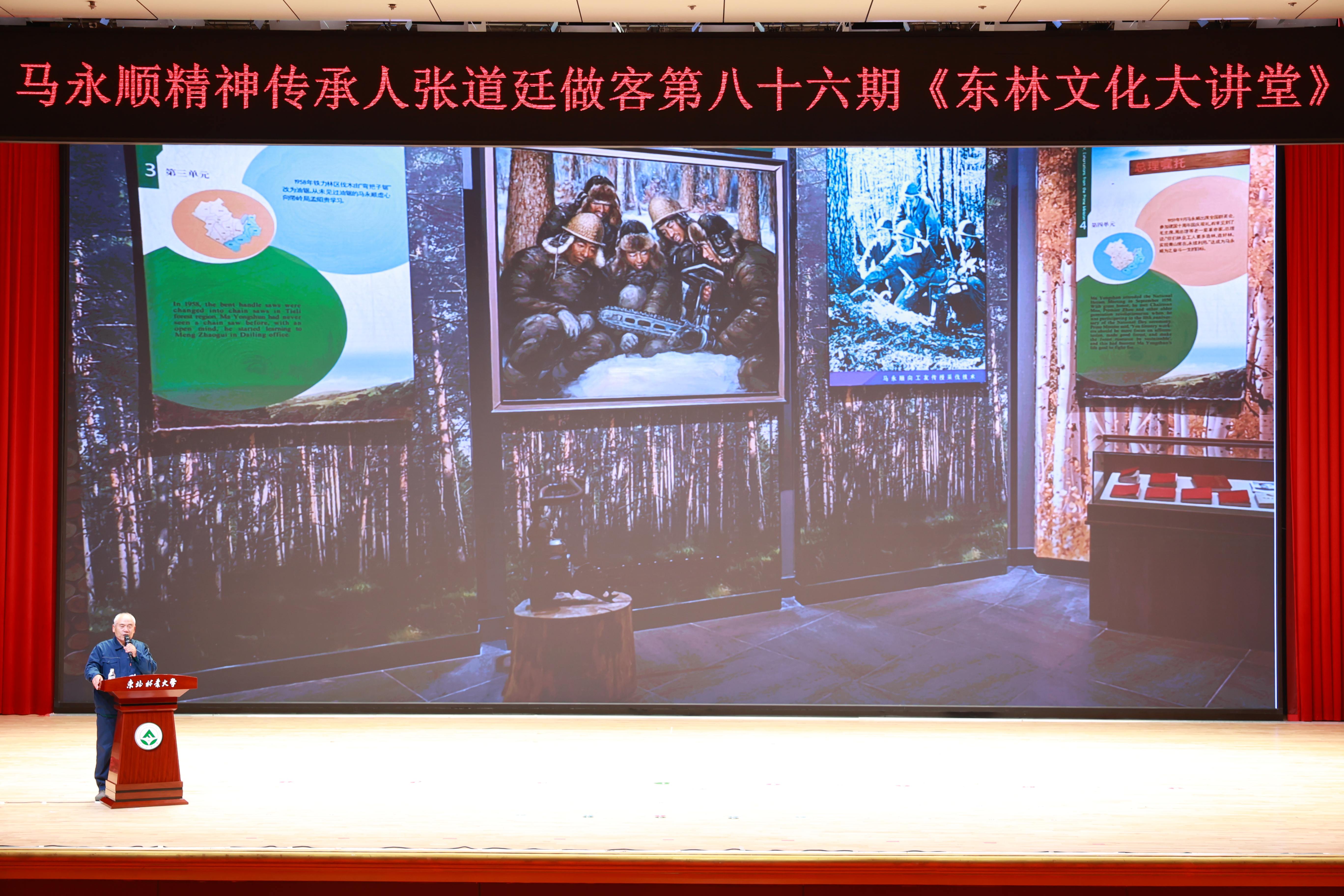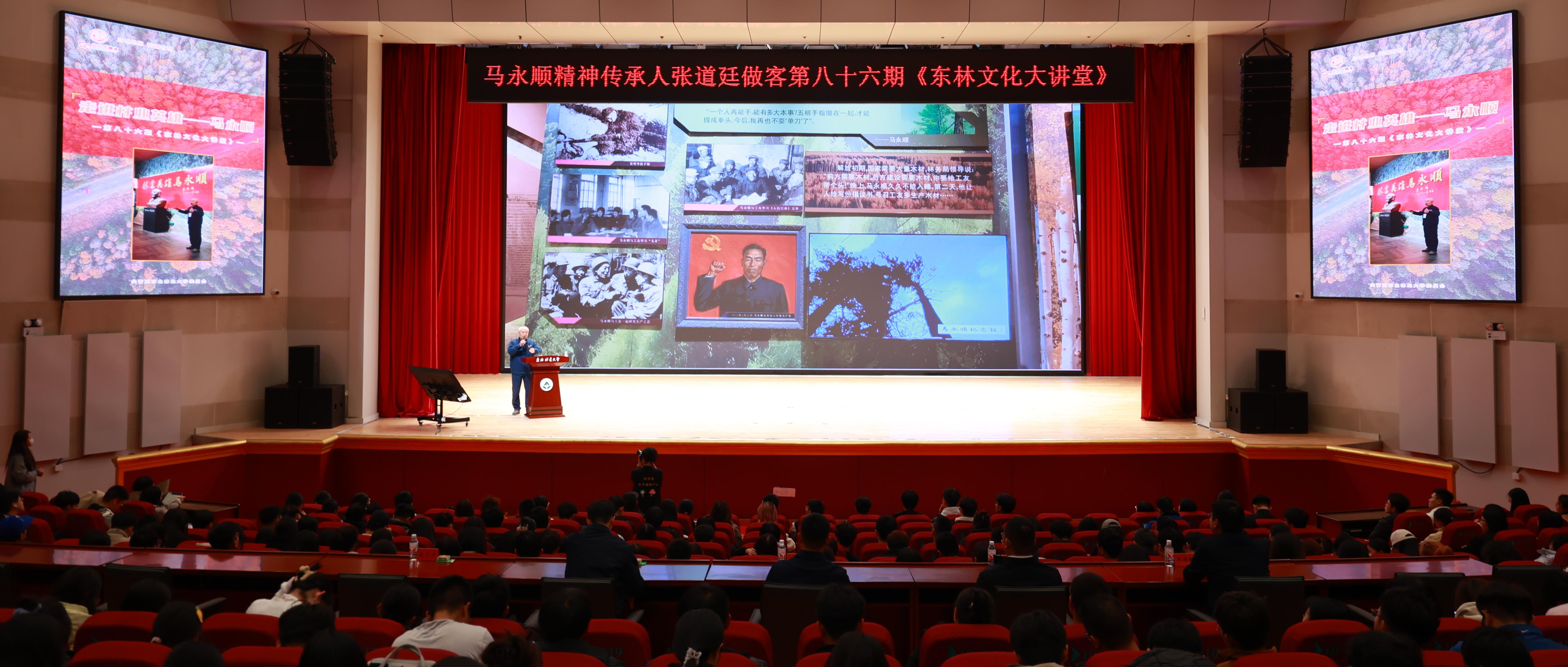 张道廷老先生讲道:“面对连续砍伐光秃秃的兴安岭,退休后的马永顺给自己定了植树的目标,要把砍下的树再种回来。他亲手栽种的4.6万余株树木已经成为全国第三处‘林业英雄林’……马永顺先生的一生,是与大自然搏斗的一生,更是与自我挑战的一生”。今年是马永顺诞辰110周年。马永顺艰苦奋斗、赤诚奉献的光辉事迹激励了一代又一代的林业人守护绿水青山。张道廷老先生鼓励东林师生要将马永顺精神内化于心、外化于行,以马永顺先生为榜样,牢固树立和践行“绿水青山就是金山银山”“冰天雪地也是金山银山”理念,抓住培育新质生产力和绿色低碳转型的发展机遇,让绿色成为推进高质量发展的底色,让绿水青山造福人民、泽被子孙。