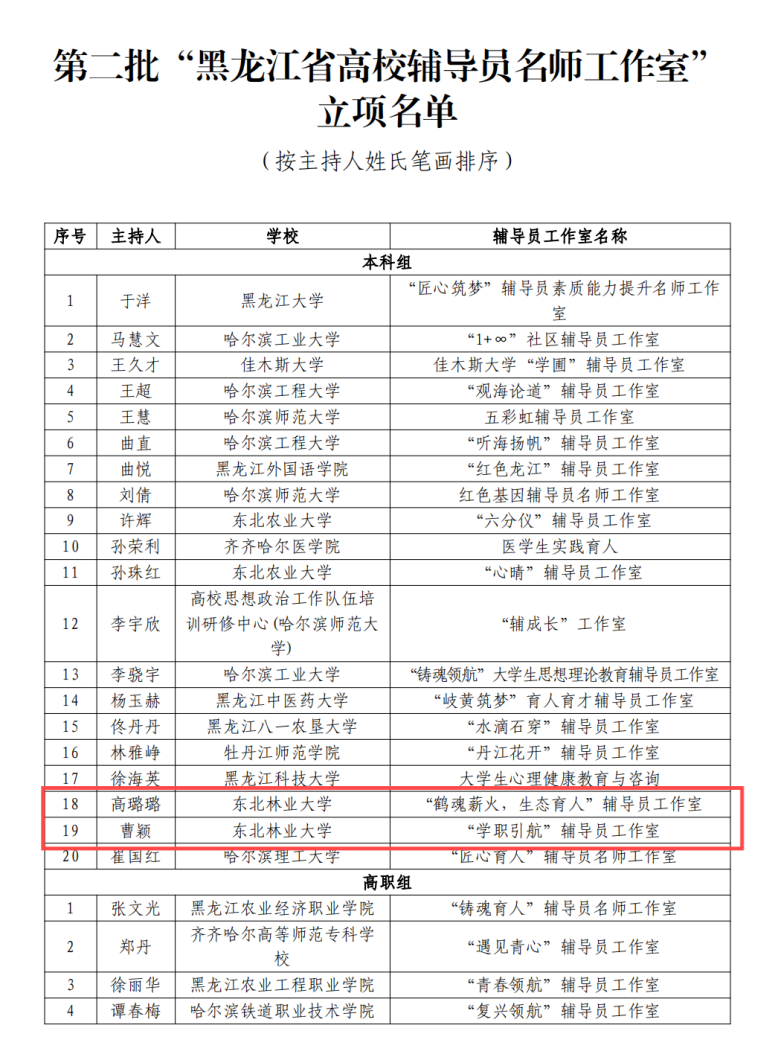 近日,经学校推荐、资格审核、通讯评审、现场答辩等环节,省委教育工委公布了《第二批“黑龙江省高校辅导员名师工作室”立项名单》,我校推荐的“鹤魂薪火,生态育人”辅导员工作室和“学职引航”辅导员工作室成功入选。