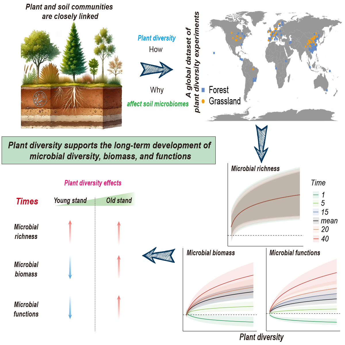 近年来,由于人类活动和全球变化的双重影响,生物多样性丧失已成为威胁人类福祉的重大问题。植物和土壤微生物作为生态系统的重要组成部分,它们的多样性共同驱动着生产力、分解、固碳、土壤肥力、病原体控制等多种生态系统功能。然而,植物多样性如何影响土壤微生物多样性、生物量和功能还不明确。此外,宏观生态学中的“累积互补效应”假说强调了植物多样性在长时间尺度上对维持和提高生态系统功能的关键驱动作用。因此,深入研究植物多样性如何调控土壤微生物多样性和功能,对于指导全球范围内的生态修复工程,如植树造林和种草等,具有重要的理论和实践意义。