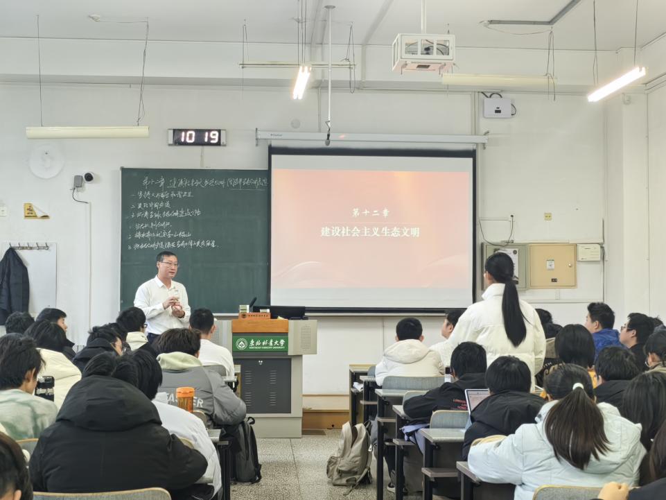 为深入学习贯彻习近平新时代中国特色社会主义思想和党的二十届三中全会精神,认真落实习近平总书记在全国教育大会上的重要讲话精神,11月22日上午,校长宋文龙走进《习近平新时代中国特色社会主义思想概论》课堂,在丹青楼211教室为2024级野生动物与自然保护区管理、化学工程与工艺专业本科生,带来题为《建设社会主义生态文明》的思想政治理论课。