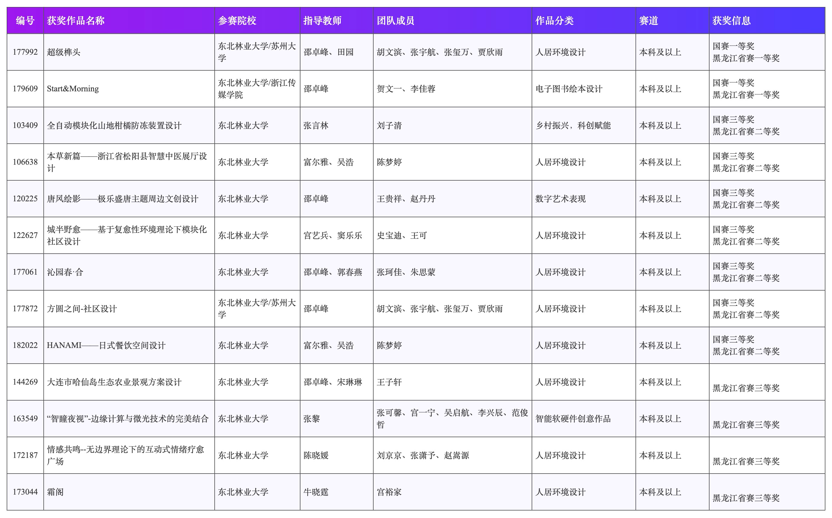 在前期的黑龙江省赛中,我校学子凭借扎实的专业基础、富有深度的设计思想和独具一格的呈现方式,共收获13个奖项,其中一等奖3项,二等奖7项,三等奖4项。其中,人居环境设计类获奖9项,电子图书绘本设计类获奖1项,乡村振兴、科技赋能赛道获奖1项,数字艺术表现赛道获奖1项,智能软硬件创意作品赛道获奖1项,充分展示了我校学生在设计领域的综合实力。