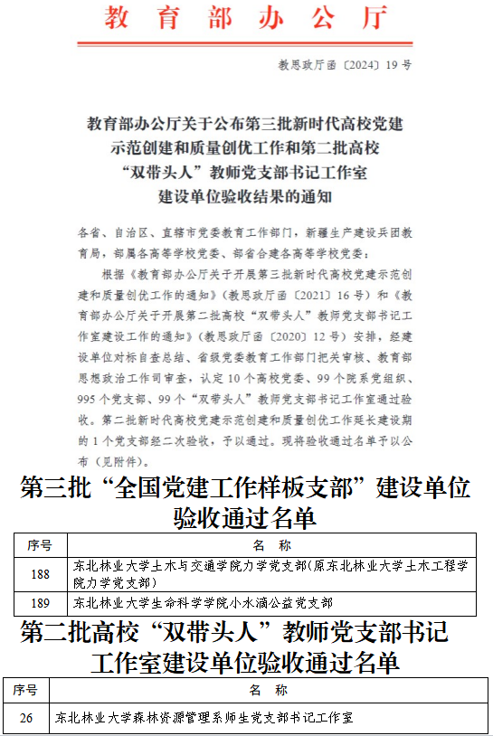 近日,教育部公布了第三批新时代高校党建示范创建和质量创优工作及第二批高校“双带头人”教师党支部书记工作室建设单位验收通过名单,我校土木与交通学院力学党支部、生命科学学院小水滴公益党支部、林学院森林资源管理系师生党支部书记工作室分别通过验收。