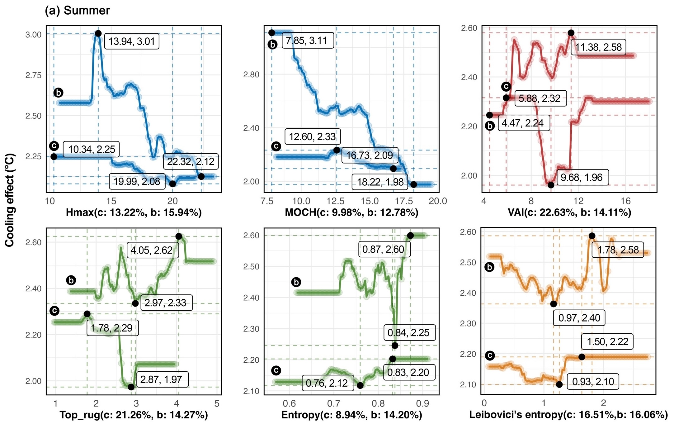 此外,研究还证实了结合激光雷达、多光谱与热红外数据,融合所有特征的数据集对城市森林物种分类具有更优的分类精度(OA=0.80, kappa=0.78)。同时,阐明了物种与群落尺度上、不同季节的物种冠层降温效果主要受到垂直结构、外部和内部异质性,以及冠层叶密度指数的影响,创新性地证实了物种空间连通性对城市森林降温效应的显著作用(图2),推进了城市森林物种与结构优化措施的具体实施。