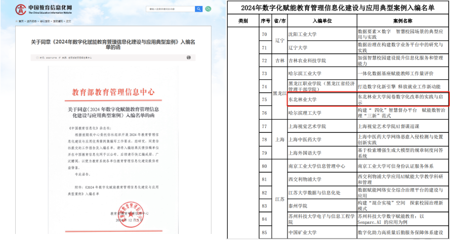 近日,教育部教育信息管理中心公布了2024年数字化赋能教育管理信息化建设与应用典型案例名单,由本科生院牵头的“东北林业大学阅卷数字化改革的实践与启示”案例成功入选。