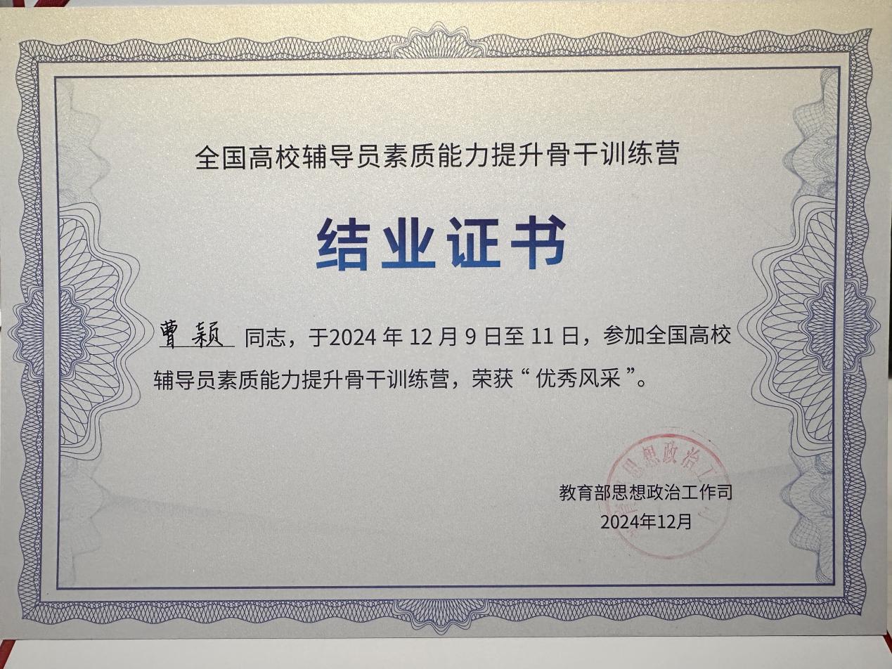 我校辅导员荣获2024年全国高校辅导员素质能力提升骨干训练营“优秀风采奖”