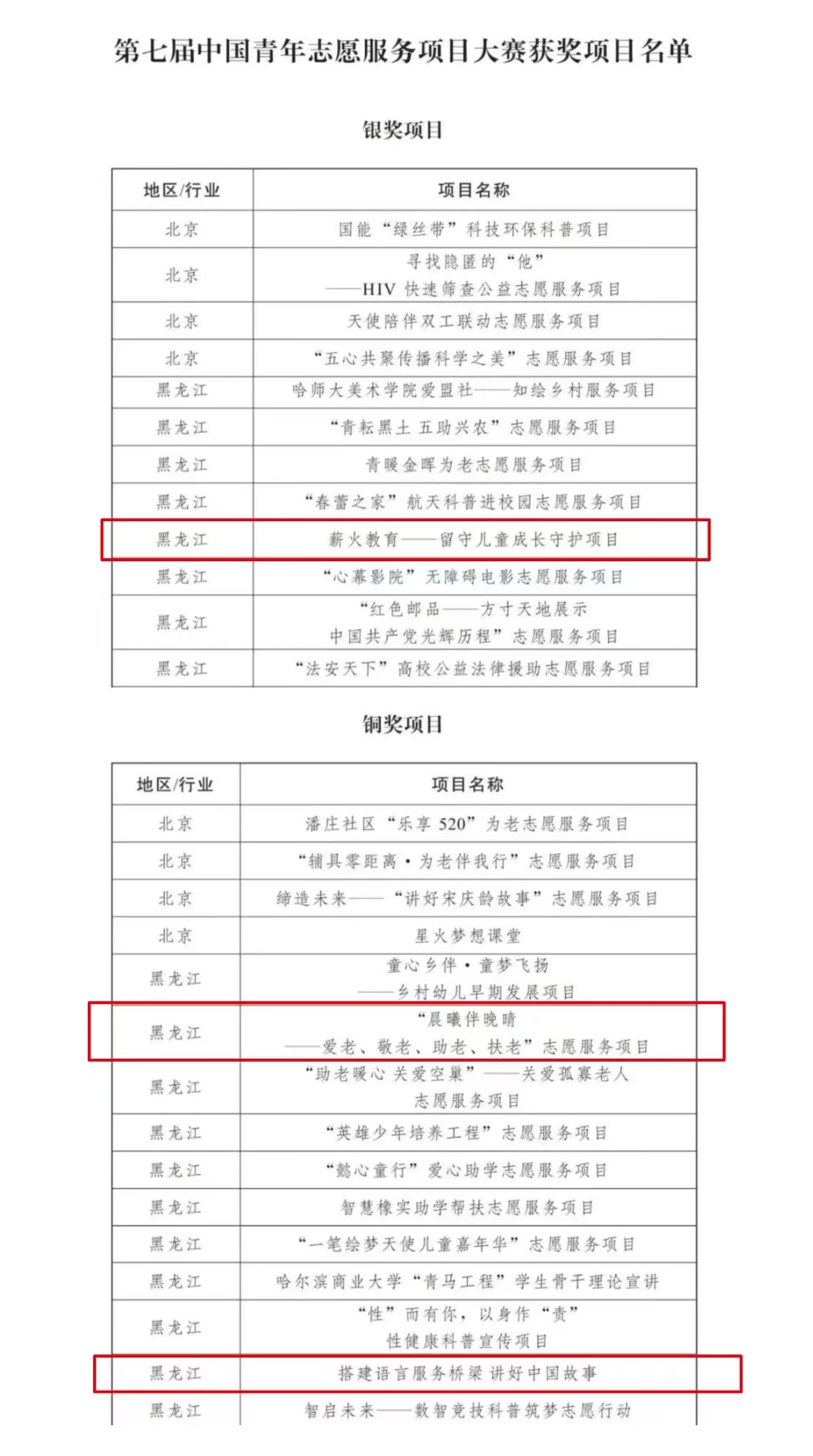 日前,第七届中国青年志愿服务项目大赛在广东汕头落幕,经组织申报、省级推报、资格审核、国赛评选、公示等工作环节,学校理学院“薪火教育——留守儿童成长守护项目”荣获银奖,机电工程学院“晨曦伴晚晴—爱老、敬老、助老、扶老”志愿服务项目、外国语学院“搭建语言服务桥梁 讲好中国故事”项目分获铜奖。