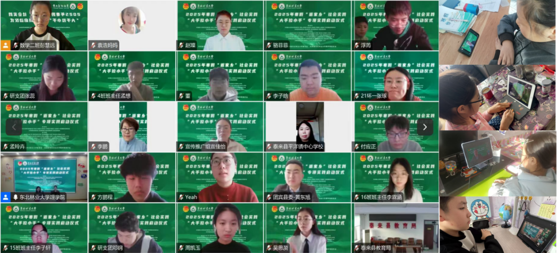 1月15日上午,东北林业大学2025年寒假“返家乡”社会实践“大手拉小手”专项实践启动仪式,通过线上、线下相结合的形式举行。宾县县委副书记马平,泰来县副县长黄英来,团香坊区委书记王喆,团宾县委书记黄东旭,团大兴安岭地委科长范清华,学校团委副书记王海飙,理学院党委书记李玉荣、党委副书记李鹏,相关县、区教育局负责同志,对接21所中小学校校长、辅导员出席启动仪式。2100余名中小学生、家长、大学生志愿者以及学校第27届研究生支教团成员线上参会。会议由学校团委挂职副书记、理学院团委书记王莹主持。