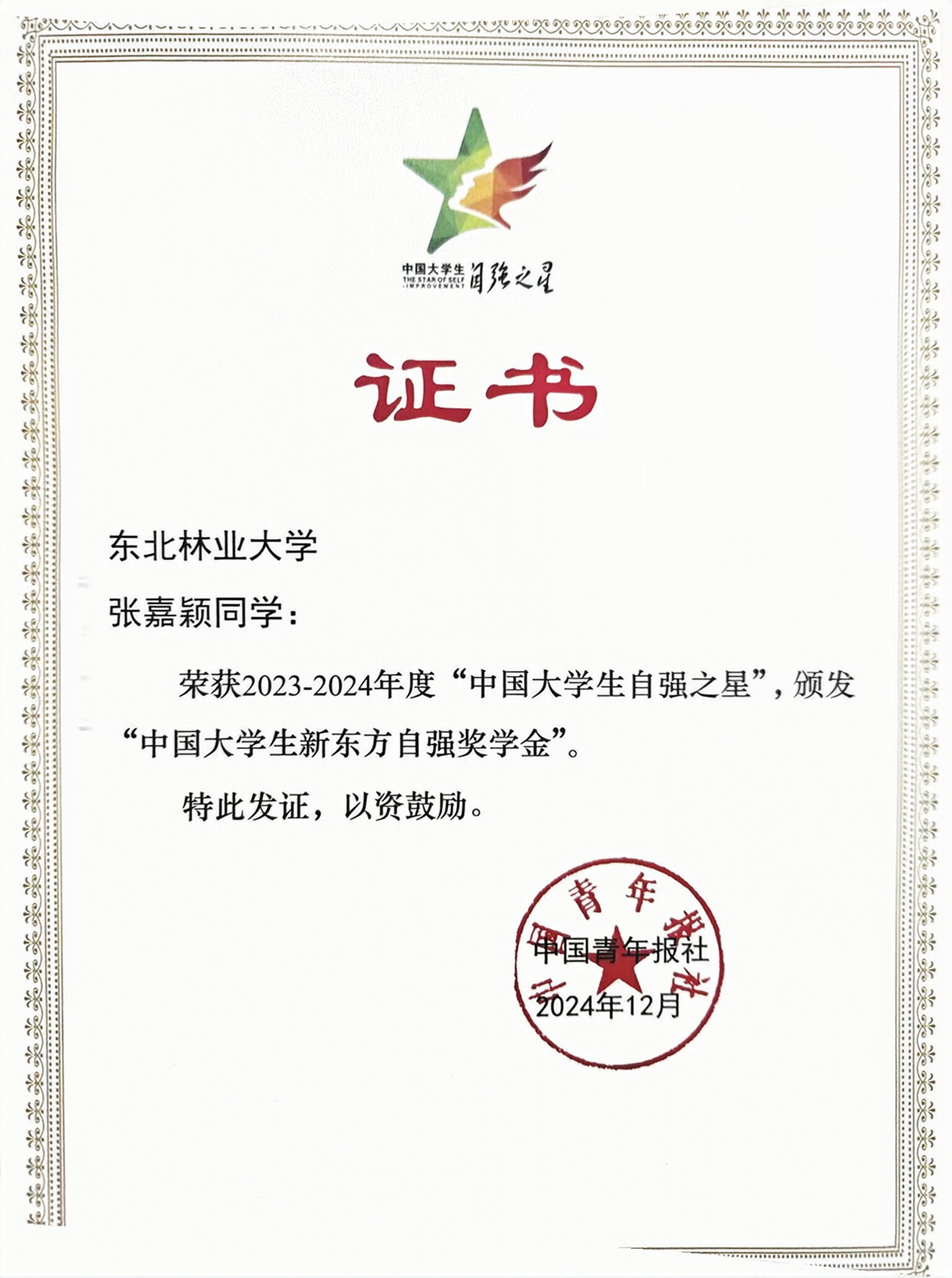 2023—2024年度“中国大学生自强之星”奖学金推报活动由共青团中央、全国学联指导,中国青年报社、新东方教育科技集团、中国青年创业就业基金会联合举办,以“自信自强 挺膺担当”为主题,鼓励青年学生在科技创新、乡村振兴、绿色发展、社会服务、卫国戍边等方面挺膺担当,展现新时代中国青年有理想、敢担当、能吃苦、肯奋斗的精神风貌,树立当代大学生热爱祖国、品行优良、不畏艰难、自强不息的榜样。该奖学金自2007年设立以来,学校共有1名学生获评“中国大学生自强之星标兵”,13人获评“中国大学生自强之星”,21人获评“中国大学生自强之星提名奖”。