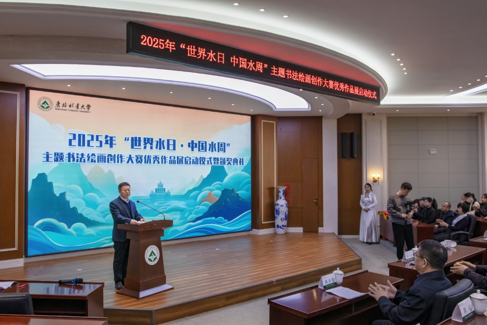 在第三十八届“中国水周”来临之际,3月24日,由黑龙江省生态环境厅、黑龙江省水利厅、黑龙江省机关事务管理局与东北林业大学联合举办的 “感江河大爱・书岁月情怀 —— 2025年‘世界水日・中国水周’主题书法绘画创作大赛优秀作品展启动仪式及颁奖典礼”在我校举行。学校党委常委、副校长翟雪峰出席活动并致辞,学校职能处室同志与相关学院师生参加活动。