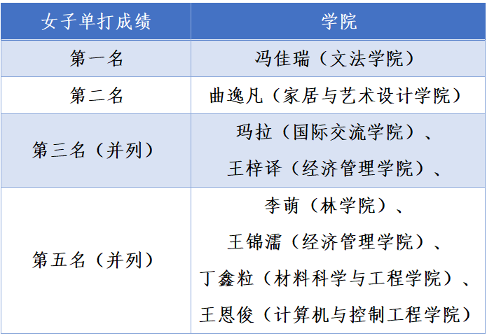 在个人赛中,奥林学院的韩宇航同学和文法学院的冯佳瑞同学凭借出色的发挥、精湛的技术,在众多高手中脱颖而出,分别获得男、女单打比赛的冠军。