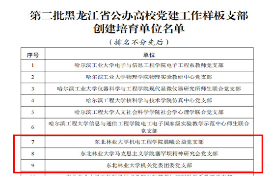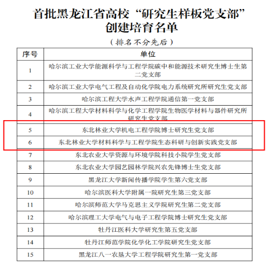 近日,黑龙江省委教育工委公布了第二批黑龙江省高校党建工作标杆院系、样板支部、“双带头人”教师党支部书记工作室和首批“研究生样板党支部”创建培育名单。我校野生动物与自然保护地学院党委、机电工程学院晨曦公益党支部、马克思主义学院塞罕坝精神研究会党支部、机关团委党支部、材料科学与工程学院林产化工教工党支部李淑君工作室、机电工程学院博士研究生党支部、材料科学与工程学院生态科研与创新实践党支部等七个党组织均在建设名单之列。