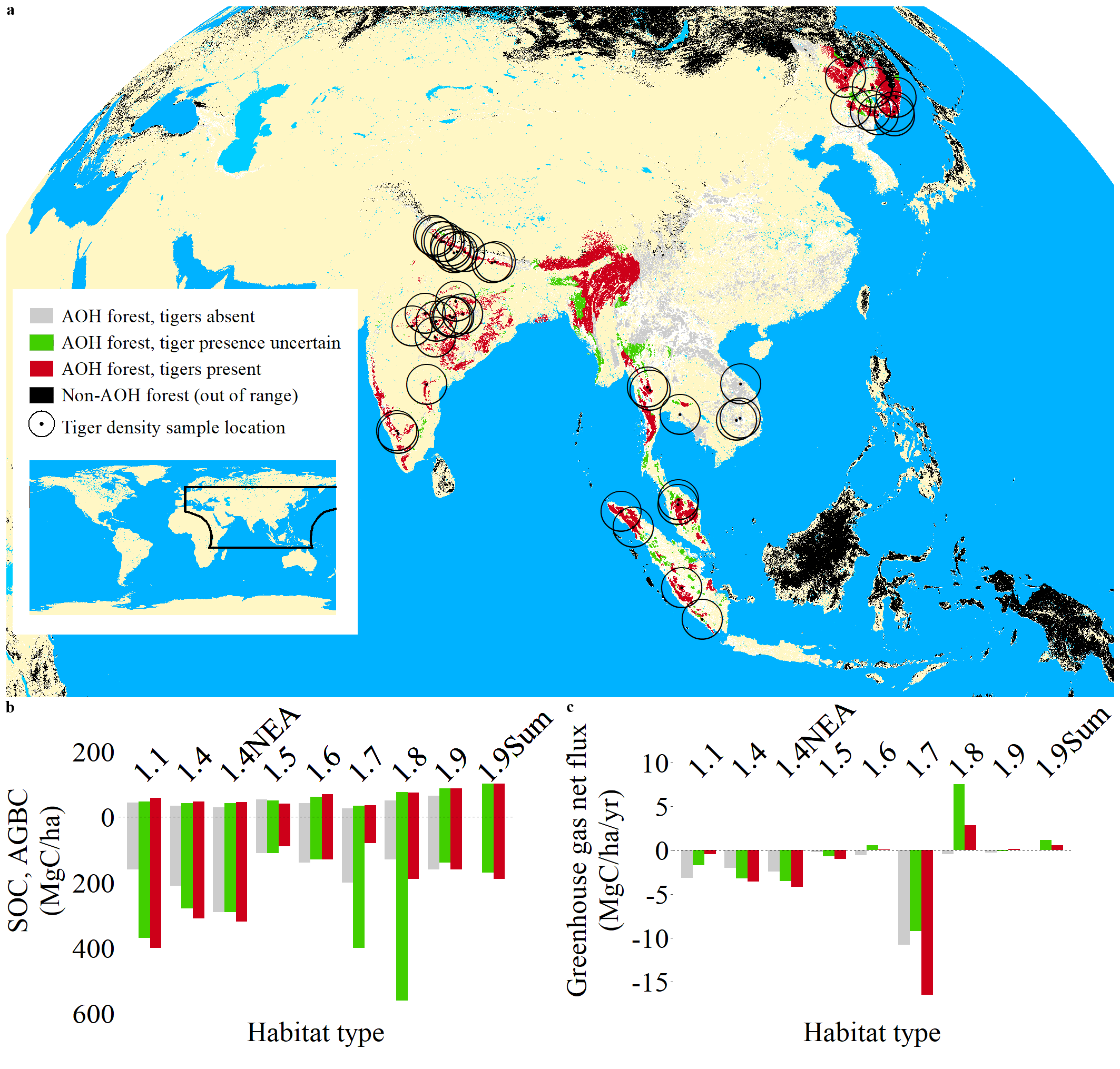 图1全球虎栖息地类型和地区的存在状况及碳指标(土壤有机碳、地上生物量和森林净碳通量)