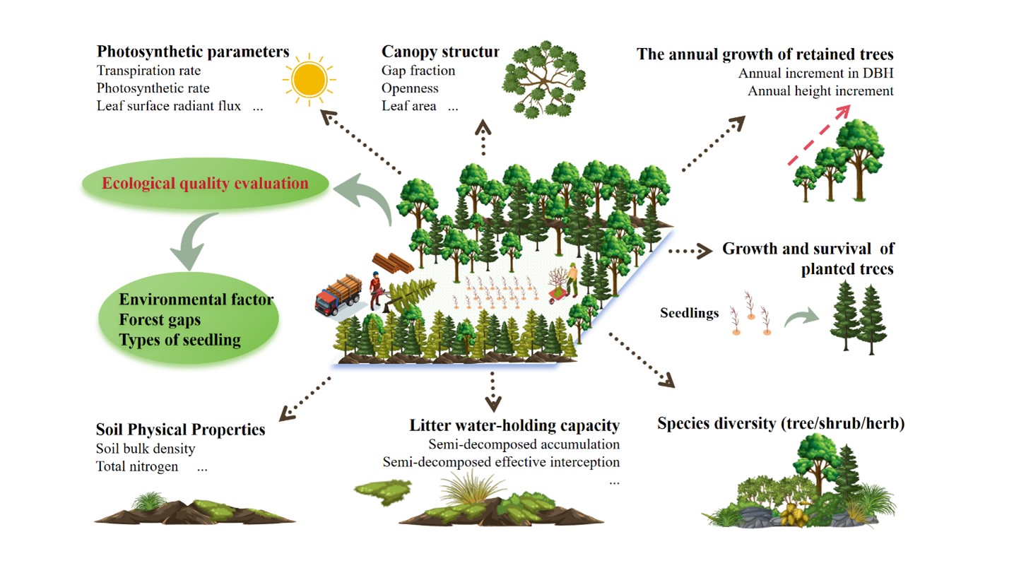 研究结果表明,土壤非毛管孔隙度与半分解枯落物的积累与截留能力是影响林窗生态质量的关键因子;宽条带状林窗在多数林型中展现出更优的生态功能表现;蒙古栎林和红松落叶松混交林中林窗生态质量整体优良,具备良好的生态恢复潜力。不同林窗类型在改善林分结构、促进幼树生长、维持生态稳定性等方面具有差异性作用。该成果为提升温带次生林生态系统功能、优化林窗布局与管理模式提供重要科学依据,也为未来的森林生态恢复工作提供实践参考。