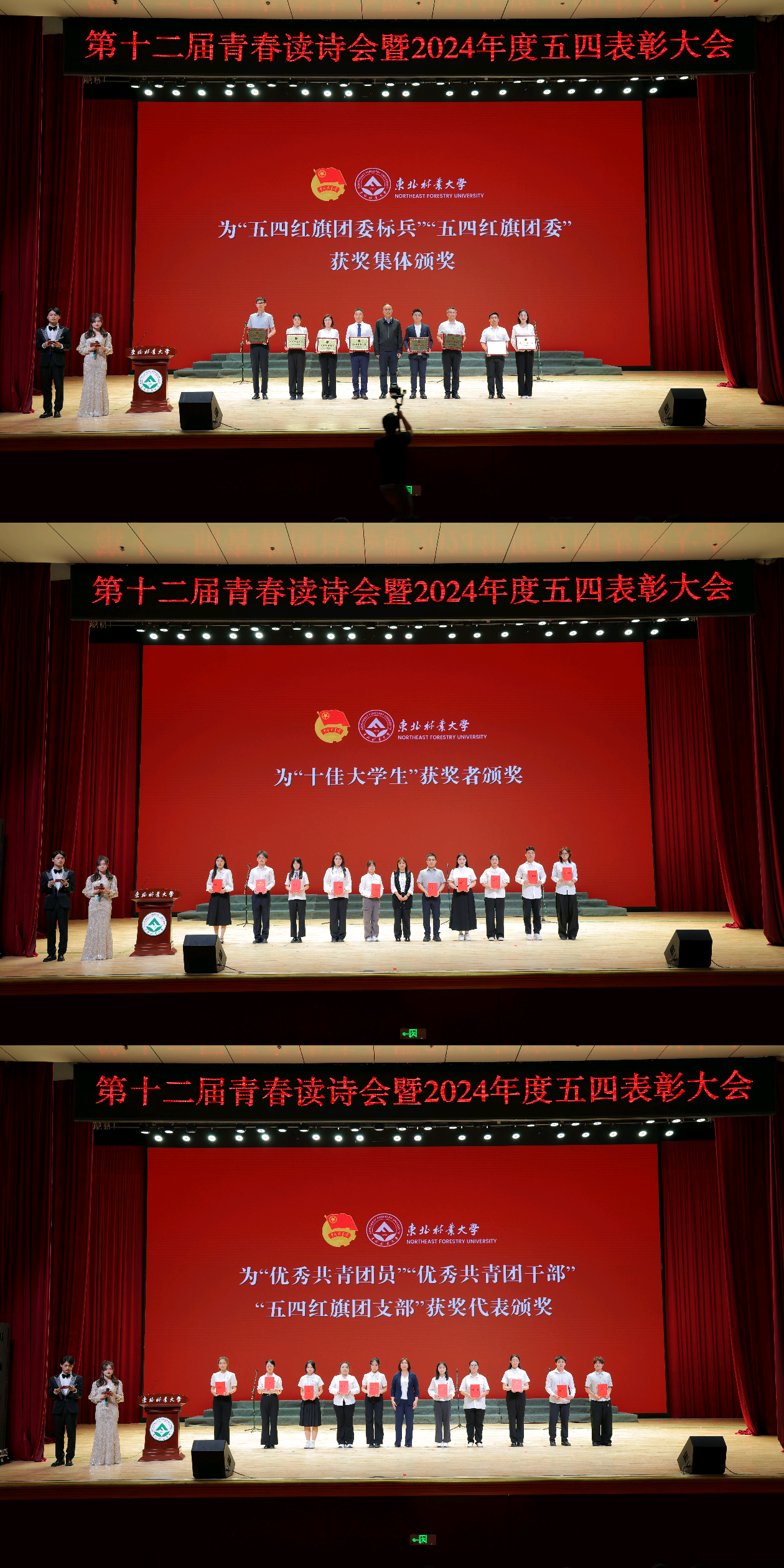 学校相关部门负责同志为“五四红旗团委标兵”“五四红旗团委”“十佳大学生”“优秀共青团员”“优秀共青团干部”“五四红旗团支部”等获奖集体和个人代表颁奖。