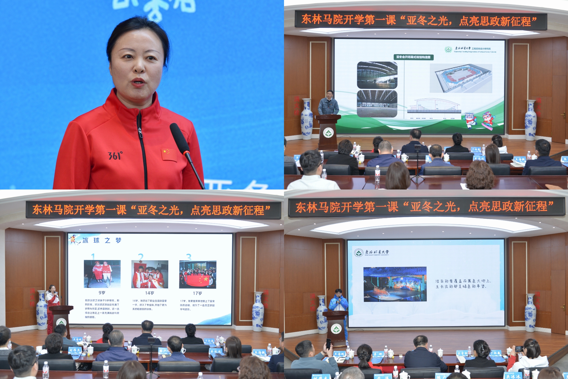 学校邀请哈尔滨学院党委副书记、第九届亚冬会执委会火炬手与志愿者管理组组长李娜,中国国家女子冰球队队长于柏巍,东北林业大学工程咨询设计研究院有限公司副总经理王海鹏,我校亚冬会志愿者陈鑫磊等嘉宾作亚冬会专题分享