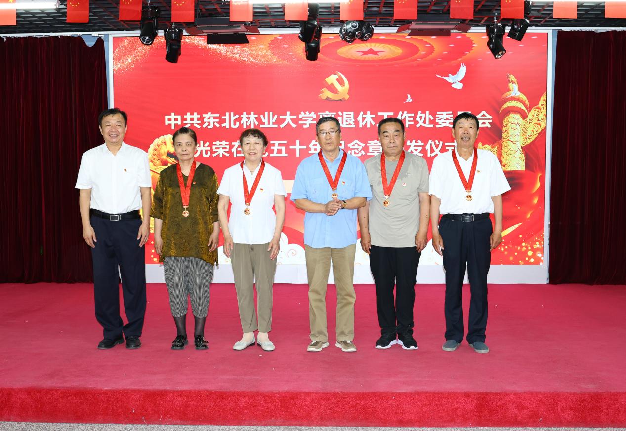 在党50年,从青丝到白发,逝去的是岁月,不变的是初心。离退处处长李长松在致辞中所说:“当看到你们两鬓的华发与胸前闪亮的党徽交相辉映,我仿佛看见五十年岁月里,你们把青春热血熔铸成党旗下的誓言——是课堂里朗朗读书声中诲人不倦的坚守,是林场创建初期‘人拉犁’时沾满泥土的脚印,是危急关头那句‘我是党员我先上的果敢。这枚纪念章,是岁月为你们镌刻的勋章,更是党和人民对你们的深情礼赞!”