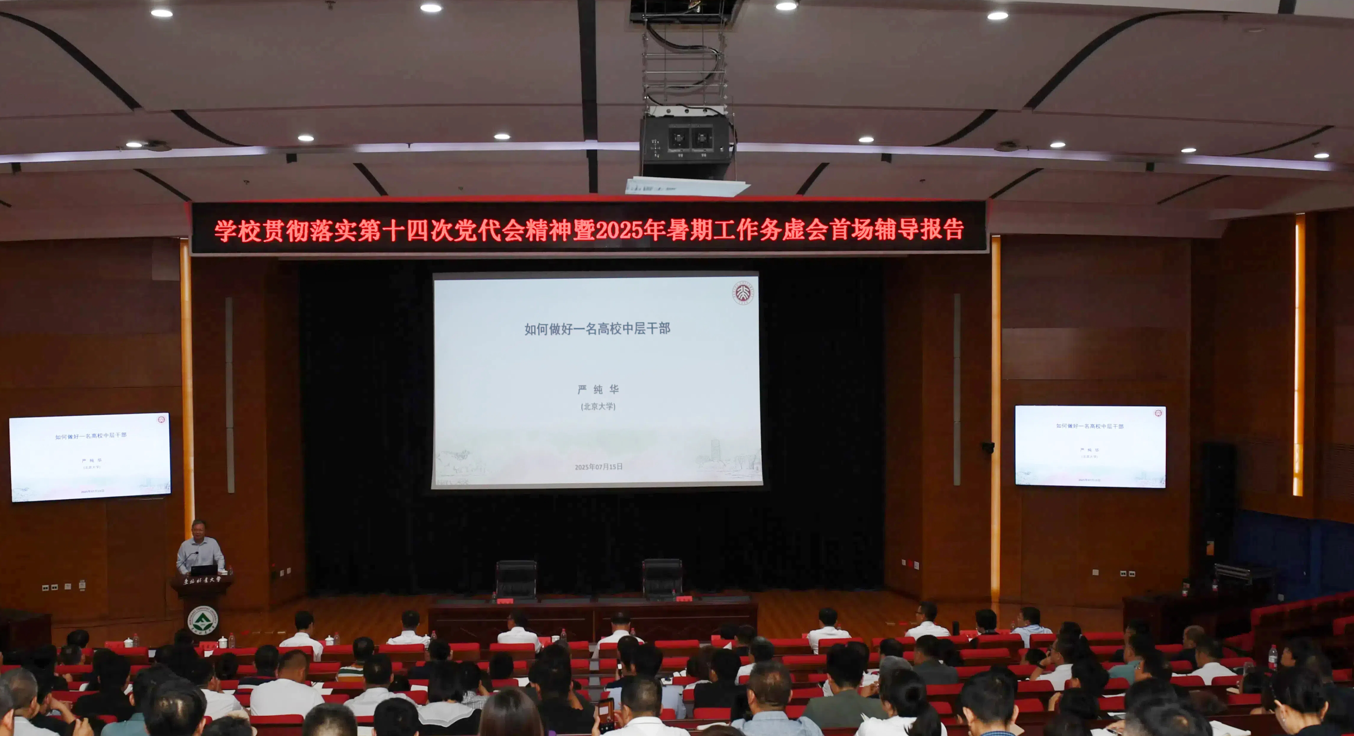 为迅速掀起学习宣传学校第十四次党代会精神热潮,深刻把握教育强国建设的任务要求,7月15日下午,学校举行2025年暑期工作务虚会首场辅导报告会。中国科学院院士、发展中国家科学院院士、兰州大学原校长严纯华教授作题为《如何做好一名高校中层干部》的辅导报告。全体在家校领导,全体中层干部参加会议。学校党委副书记翟雪峰主持报告会。