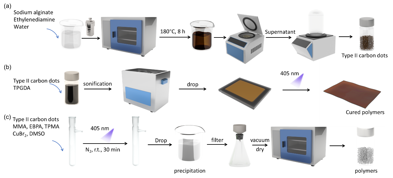 在光聚合领域中,光引发剂是至关重要的物质。传统的光引发剂虽然有着较高的引发速率,但是其存在生物毒性,特别是光裂解产生的小分子易于迁移到材料表面,进而引发了人们对光聚合产物安全性的担忧。因此,开发引发效率高、毒性低的光引发剂成为研究的热点。近年来,化学化工与资源利用学院罗雄飞副教授等致力于生物质基光引发剂、生物质纳米肥的研究与开发。研究表明,碳点基光引发剂凭借其高引发效率、低生物毒性及弱迁移特性,在传统自由基光聚合与可控/活性聚合(如RAFT、ATRP)中均呈现卓越性能。其研究系统阐释了生物质碳点的绿色合成路径与构效表征方法,揭示了碳点引发自由基聚合及可控光聚合的反应动力学机制;同时通过实时傅里叶变换红外光谱(RT-FTIR)、光差示扫描量热技术(Photo-DSC)、动态力学分析(DMA)及凝胶渗透色谱(GPC)等先进分析技术,实现了对聚合过程动力学、单体实时转化率及分子量分布的多维解析,为产物性能调控提供了技术支撑。