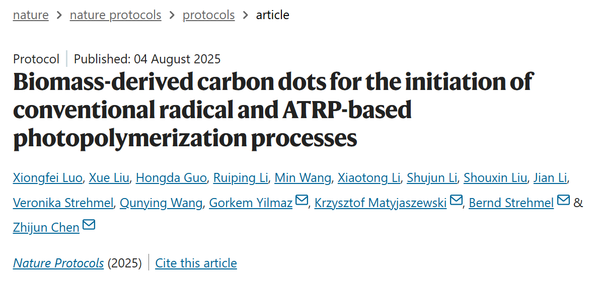 近日,我校在国际权威期刊Nature Protocols(影响因子16)发表了题为“Biomass-derived carbon dots for the initiation of conventional radical and ATRP based photopolymerization processes”的研究性论文。该研究为高性能、环境友好型生物质基光引发剂的开发提供了重要的理论依据。