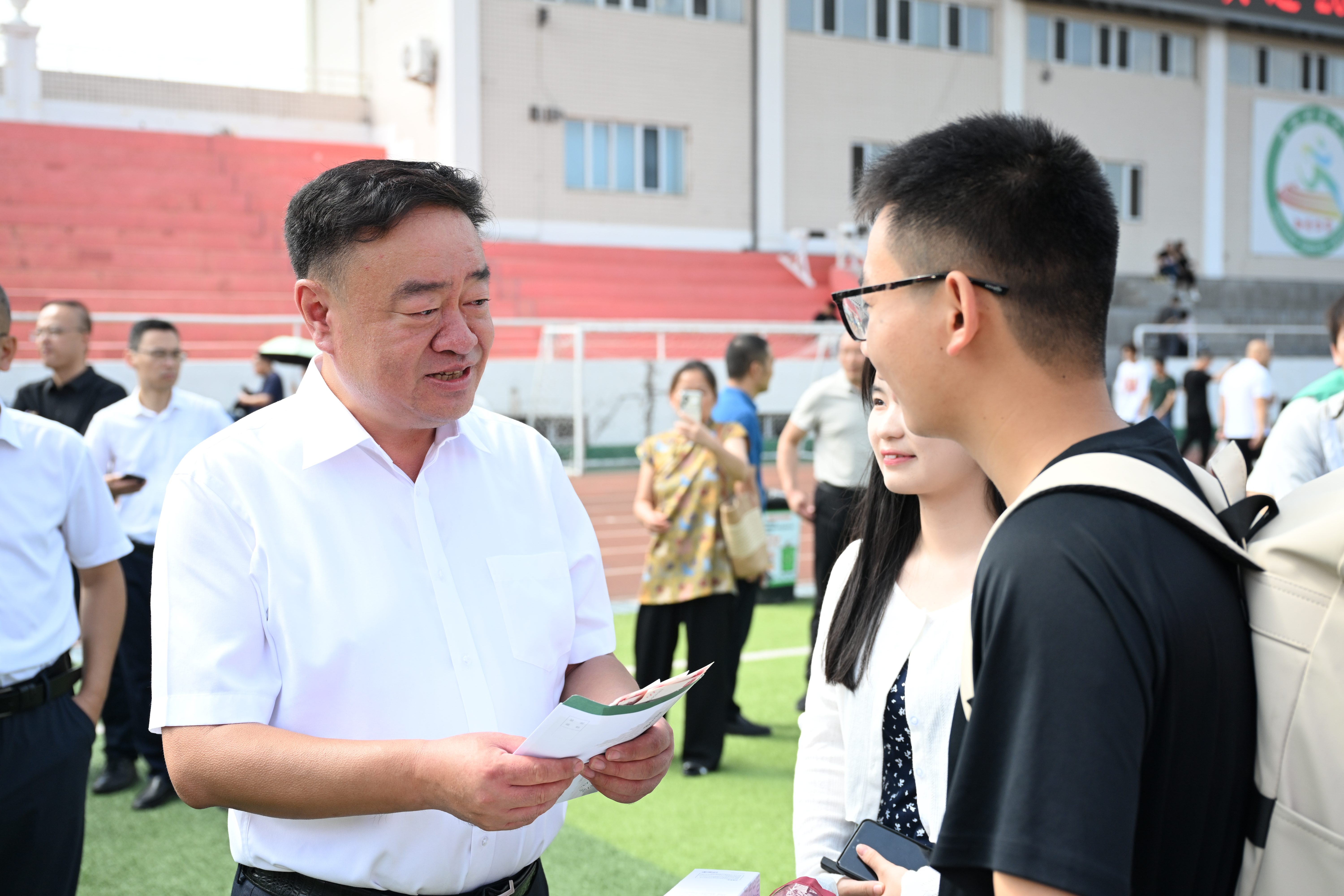 在学校体育场设置的各学院展位前,有彰显学院特色的专属打卡区,有代表新生报到顺序的特色拼图,有尽显师生温暖的贴心服务……校领导依次走过各个学院迎新展位,与学院负责人详细询问新生报到情况、生源地分布及报到流程顺畅度等,对各学院将学院特色、专业特色、东林特色融入迎新工作的精巧构思表示肯定。