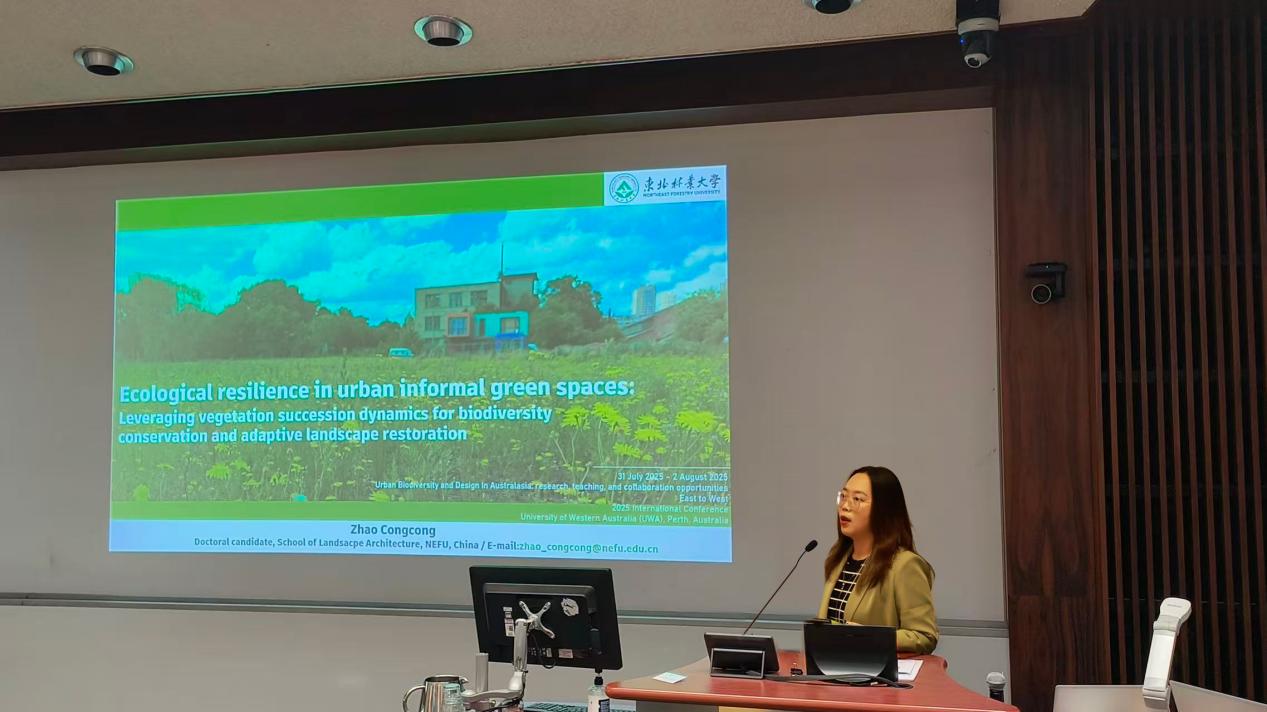 大会学术报告环节,园林学院2024级风景园林专业博士生赵聪聪以“Ecological resilience in urban informal green spaces: leveraging vegetation succession dynamicsfor biodiversity conservation and adaptive landscape restoration”为题作学术报告,深入剖析了城市工业废弃地作为典型非正式绿地的植被群落演替动态与稳定性机制,提出了基于自然解决方案(NBS)的生态修复理论框架与适应性景观恢复实践路径。