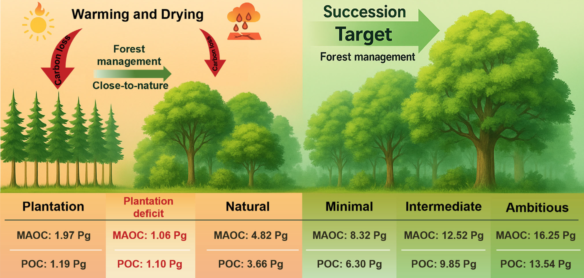 随机森林模型的评估结果显示,我国天然林土壤MAOC和POC储量分别为4.82 Pg(Pg单位为10亿吨)和3.66 Pg,而人工林土壤MAOC和POC储量则为1.97 Pg和1.18Pg。若将人工林土壤碳固持能力提升至与天然林相同水平,我国人工林土壤可额外固存约2.17 Pg碳。相较于天然林,人工林土壤碳储量缺口相当于我国陆地生态系统近10年的累计碳汇。进一步的整合分析表明,对人工林实施近自然改造约15年,可将土壤碳储量提升43 %。因此,近自然改造是提升现有人工林土壤固碳能力的关键且高效的措施。