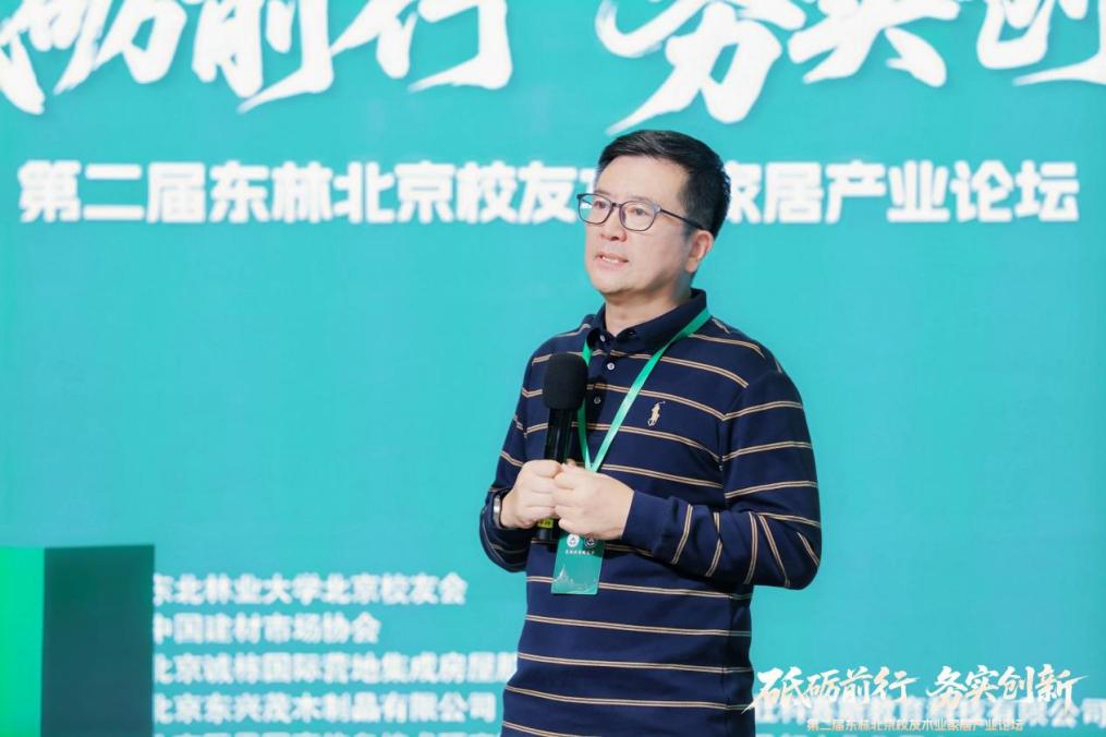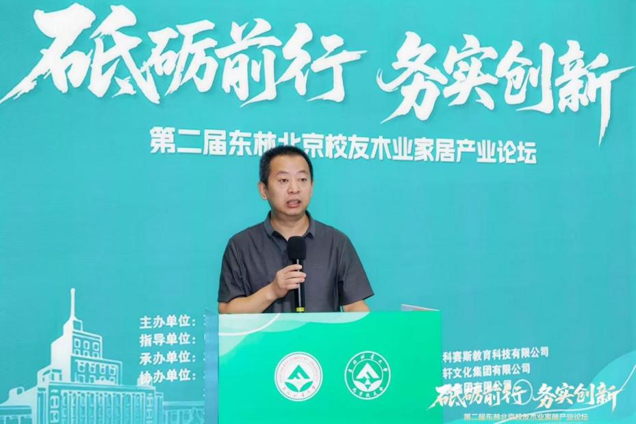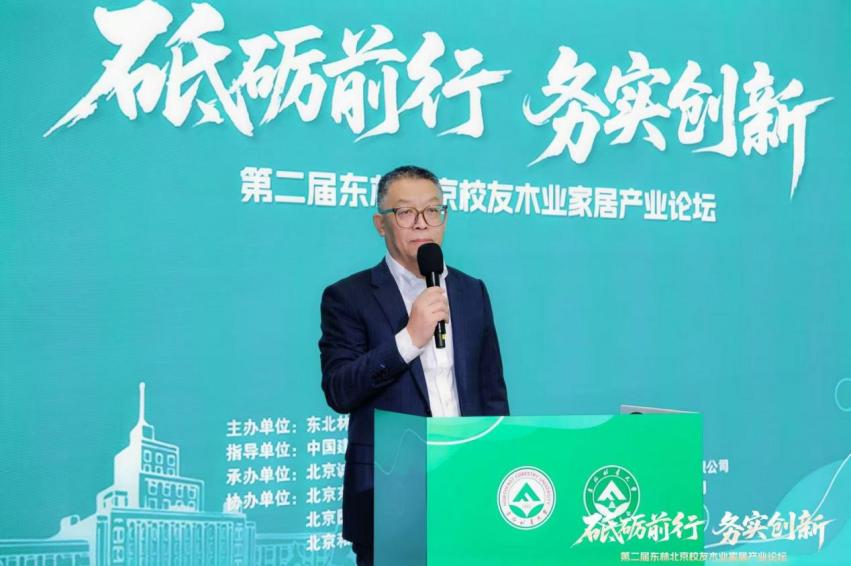东北林业大学北京校友会会长赵政文致开幕词,他简要介绍了论坛的背景和意义,强调了木业家居产业在当前经济环境下的重要地位和发展机遇。他希望通过本次论坛,为行业内校友提供一个交流思想、分享经验、寻找方法的平台,促进企业提质升级,产学融合。