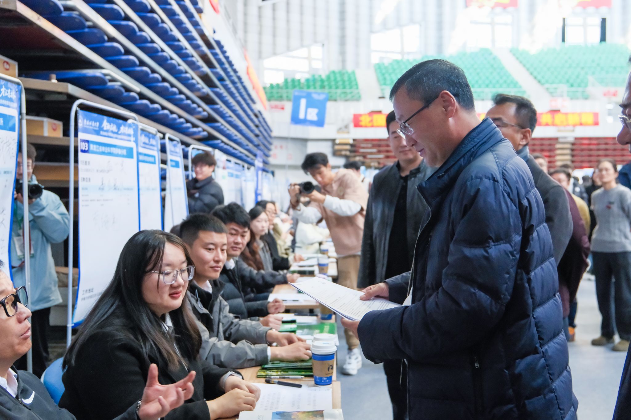 双选会现场,广大毕业生积极投递简历,人头攒动、气氛热烈。校长宋文龙,党委常委、副校长张春雷来到现场,与参展企事业单位代表交流,充分了解了新形势下用人单位的招聘需求,对我校人才培养、学科建设、就业服务等方面的意见建议;与现场求职的学生亲切交流,了解求职情况。各学院党政领导班子成员、毕业年级辅导员也来到现场,与用人单位深入交流,挖掘岗位资源,推荐本学院优秀毕业生。