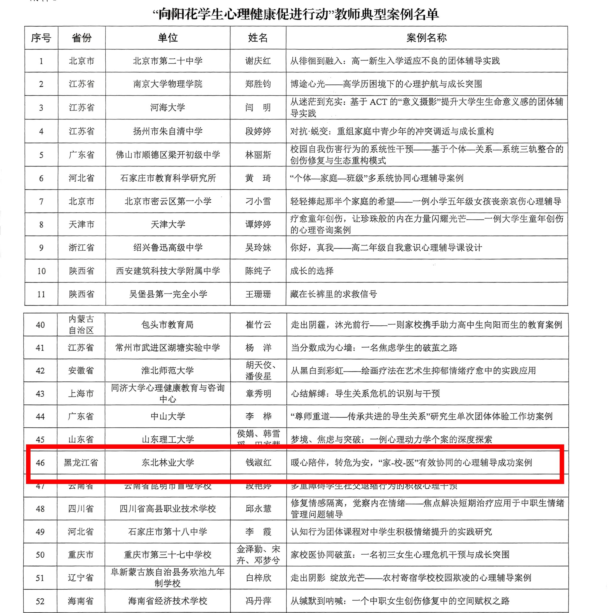 11月3日,教育部学生服务与素质发展中心发布向阳花学生心理健康促进行动101个典型案例,我校党委学生工作部教师钱淑红撰写的《暖心陪伴,转危为安,“家-校-医”有效协同的心理辅导成功案例》成功入选,为黑龙江省唯一一个高校心理教师典型案例。