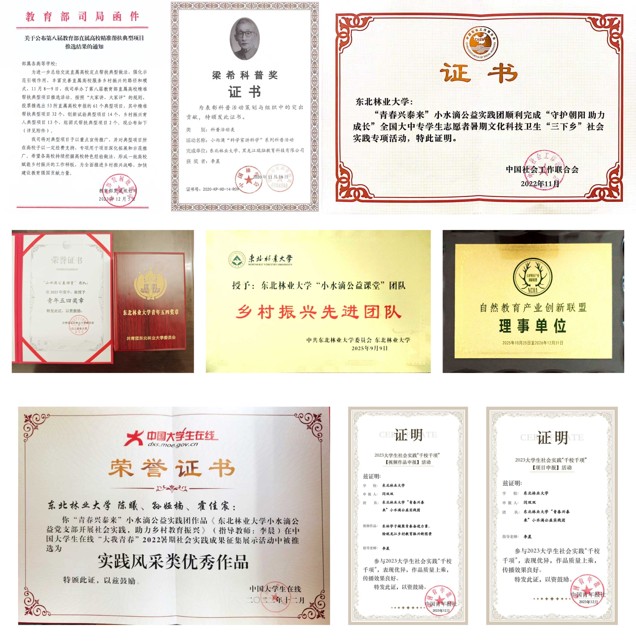 众多荣誉,是团队服务社会的最好证明。项目获评中国大学生在线实践风采类优秀作品、“守护朝阳,助力成长”三下乡社会实践百所优秀高校团队、大学生社会实践“千校千项”项目优秀和视频优秀、教育部直属高校精准帮扶典型项目、梁希科普奖等,以团队为基础建立的党支部成为学校首个获得全国党建工作样板支部的学生支部,项目案例在教育部网站发布并推广……