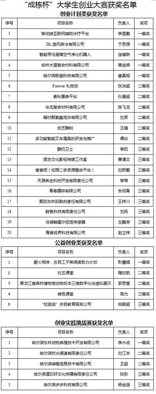日前,我校首届“成栋杯”大学生创新创业大赛的子赛事—大学生创业大赛获奖名单揭晓。《移动端互联网辅助诊疗平台》等5个项目获创业计划类一等奖,《薪火相传,农民工子弟阅读助力计划》项目获公益创业类一等奖,《哈尔滨东林动物养殖技术开发有限公司》项目获创业实践挑战赛一等奖。