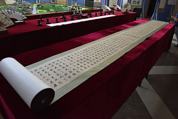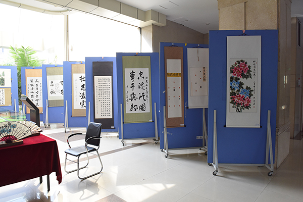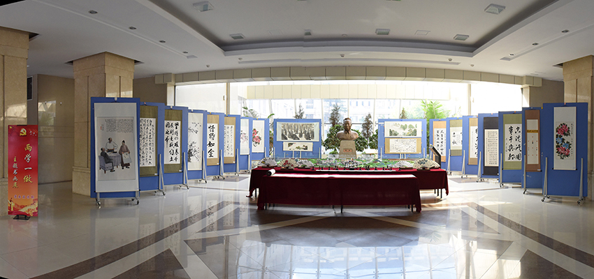 此次主题书画展共展出作品40余幅,均由我校师生创作。参展作品形式多样、内容丰富,书法作品篆、隶、楷、行、草种类齐全,条幅、横幅、扇面等形式俱备,绘画作品或写实或会意,或醉墨淋漓或写意挥洒,更兼有“道印轩”具有浓厚传统文化底蕴的篆刻艺术作品,以及我校教师完整抄录的《党章》百米长卷,具有很强的思想性和观赏性,充分展现了我校师生的才情智慧和艺术品格。