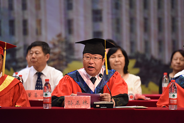 学校学位评定委员会主席、校长杨传平向2016届毕业研究生表示衷心的祝贺。他从两个方面对毕业研究生表达了深情祝福和临行嘱托。第一,要持续读书和学习,不断充实和提高自己。读书有三重境界,即为知、为己、为人。培养自己的人格、道德和情操,只有持续读书和学习,不断充实和提高自己,博士才能真正“博采众长”,硕士才能真正“硕学通儒”。第二,用创新思维,去探索和发现新世界。要时刻保持和提升创新意识,坚持独立思考,勇于探索,不随波逐流,不人云亦云。用自己的头脑和心灵,从不同角度去观察世界、认知世界、改造世界,在人生道路上书写属于自己的独特篇章。