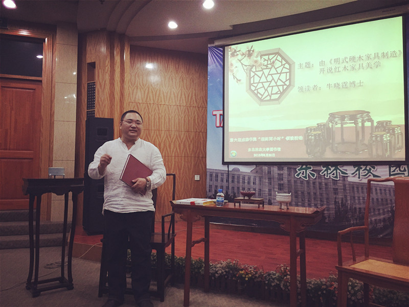 二个小时的活动,牛晓霆一直坚持站立讲解,满怀真诚,学识渊博,解读精彩,让读者深刻领略到明式硬木家具中承载的文人智慧、工匠技艺以及传承独特的美学价值。校党委宣传部、图书馆相关负责人及热心读者参加了本次活动。校图书馆赵一霖老师主持了活动。(杨世静)