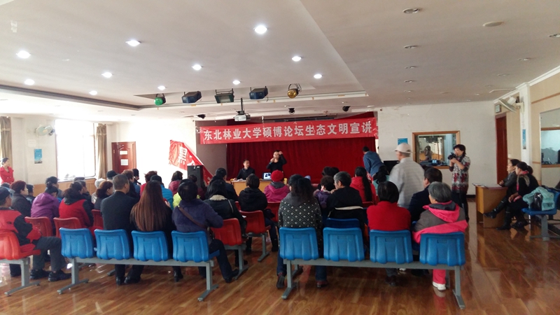 2015年10月东北林业大学“硕博论坛”生态文明宣讲团深入哈尔滨市各街道社区、学校等,陆续开展了十几期生态文明宣讲及图片展,现场参与千余人次。
